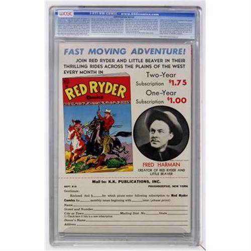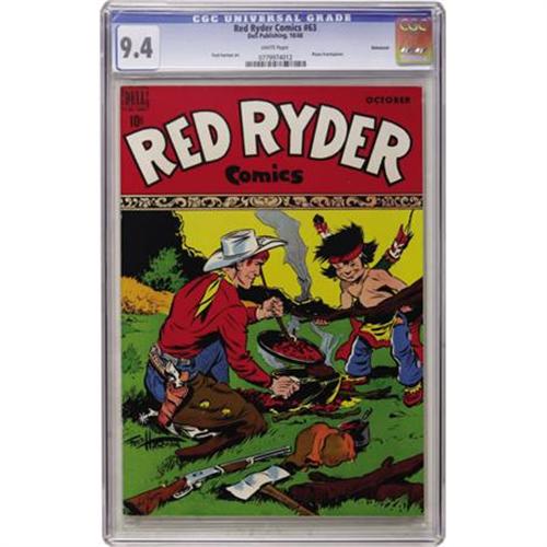 <B>Red Ryder Comics #63 Vancouver pedigree (Dell, 1948) CGC NM 9.4 White pages.</B></I> Only CGC-certified copy to date of this issue, and the Vancouver Copy, white pages and all, will be awfully hard to beat! Fred Harman cover and interior art. Photo frontispiece. Overstreet 2007 NM- 9.2 value = $105. CGC census 6/07: 1 in 9.4, none higher.<BR><BR><b>Shipping:</b> Comics - Slabbed (certified) (<a target="_blank" href="http://www.heritageauctions.com/common/shipping.php">view shipping information</a>)
