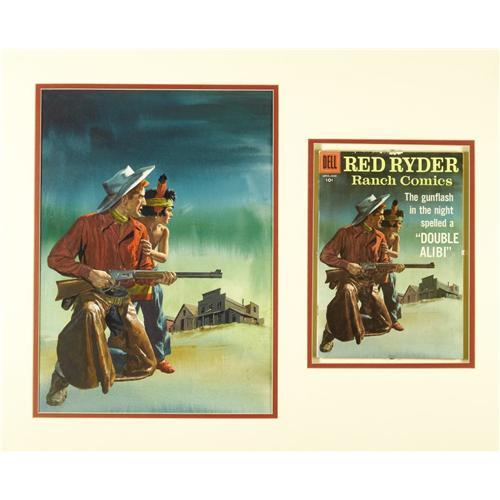 <I>Aw - haw! </B></I>Red Ryder and Little Beaver take center stage in this rootin'-tootin' painted cover. The art was matted and framed alongside a copy of the comic book. The frame has an overall size of 30" x 25.5", and the art is in Excellent condition. <BR><BR><b>Shipping:</b> Framed (<a target="_blank" href="http://www.heritageauctions.com/common/shipping.php">view shipping information</a>)