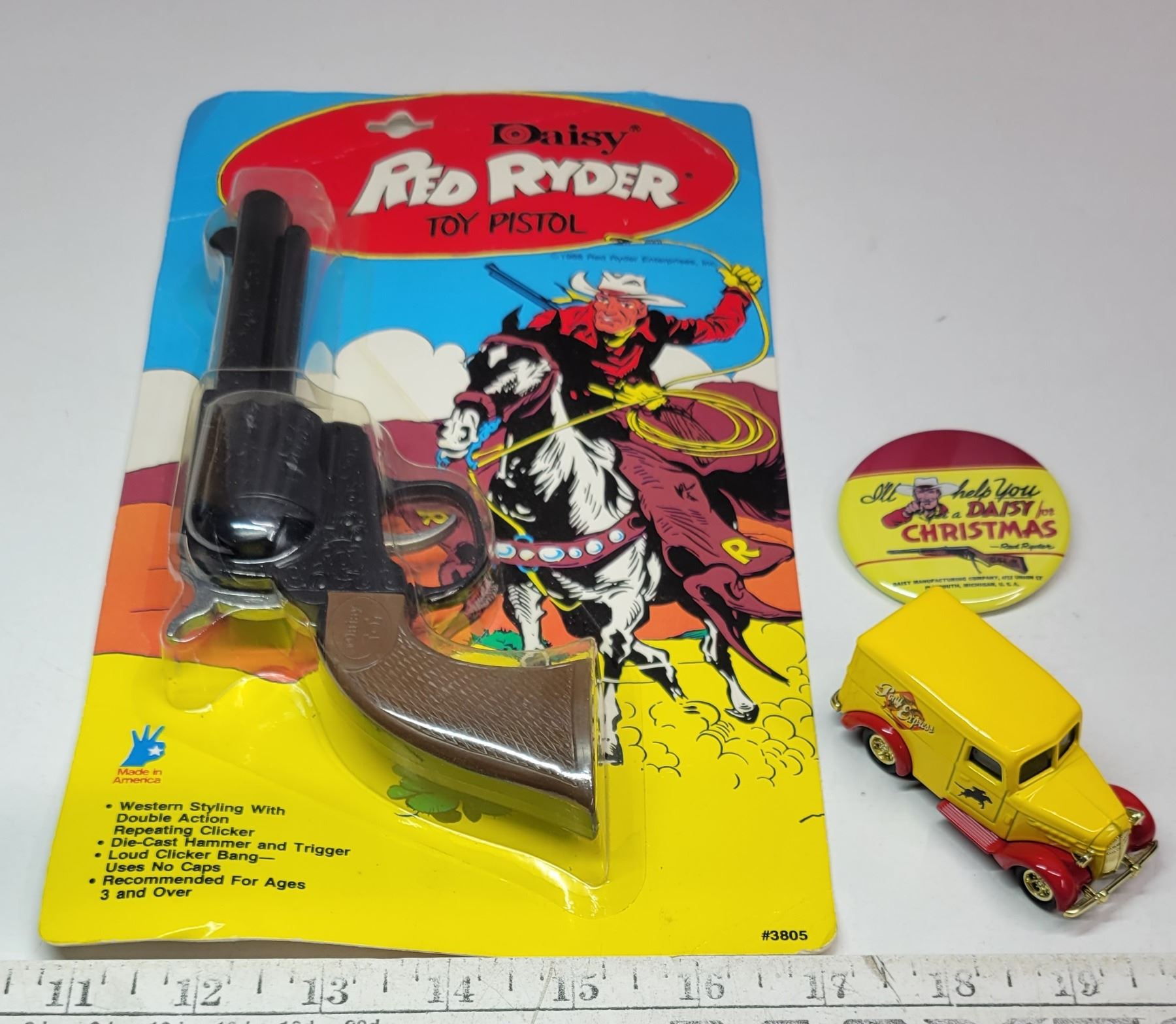 Red Ryder Toy Pistol (sealed), Button and Matchbox Car