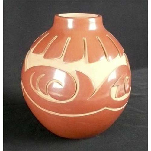 2343 Red Santa Clara Carved Pot Signed Ethal Vigil 6" Tall x 5" dia.