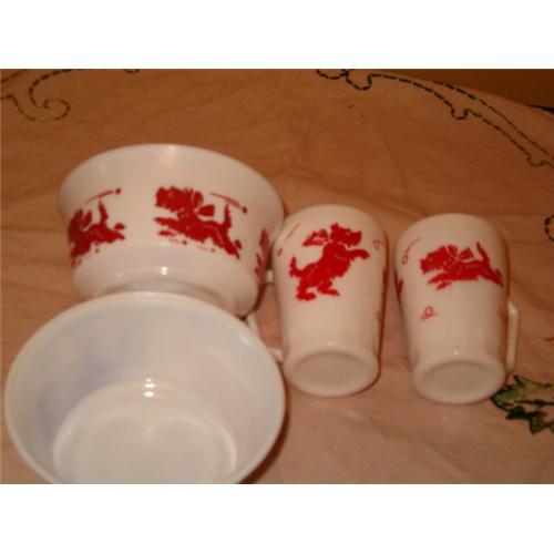 2 Hazel-atlas Red Scotty dog child's bowl and mug sets. These vintage sets are milk glass with red scotty dogs all around. The bowl measures 5" across and the mug is 3 3/4" tall. There are no chips or cracks. Red is in mint condition and not faded