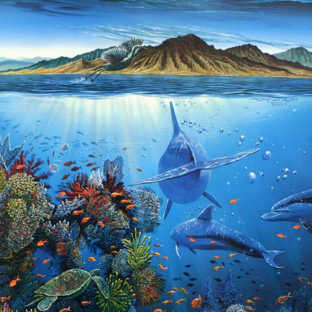 "Red Sea Sirens" is a limited edition mixed media on paper by Robert Lyn Nelson, numbered and hand signed by the artist. Includes Certificate of Authenticity! Measures Approx. 18.5" x 27.5" (with border), 16" x 25" (image).
