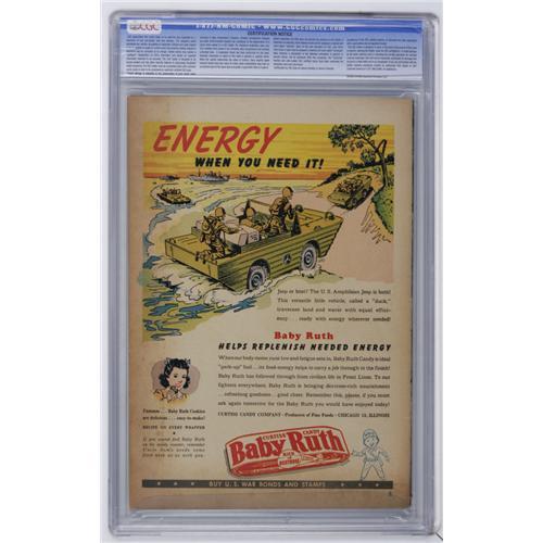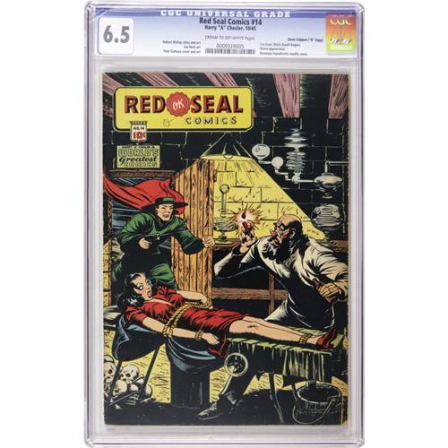 If you've been following our weekly auctions, you've seen these bizarre bondage covers from the house of Chesler sell for multiples of Guide in many cases. This effort not only has the infamous hypodermic needle motif, it's drawn by Paul Gattuso, whose style you might recognize from the infamous "children told me what the man was going to do with the red-hot poker" panel he drew for another book. Highly collectible stuff, and this is the only unrestored copy of the issue yet certified. Overstreet 2006 FN 6.0 value = $222; VF 8.0 value = $463. CGC census 11/06: 1 in 6.5, none higher. <I>From the Crippen Collection.</B></I><BR><BR><b>Shipping:</b> Slabbed Comic (<a target="_blank" href="http://www.heritageauctions.com/common/shipping.php">view shipping information</a>)