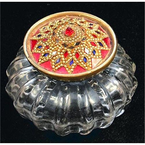 </font></strong>Produced, we believe, in Czeckoslovakia circa 1920-30s. This most unusual antique powder or vanity jar features an ornate and very heavy brass lid, decorated with dozens of diamond shape red, silver and blue pieces of glass and myriads of gold and silver Moriage beading that form an intricately constructed star bordered by larger reg triangular bits of glass - topped with a red glass jewel. All and all an incredible piece of mosaic art. The base is clear and pumpkin shaped. Measuring about 3 1/2 in diameter x 2 3/4 inches tall and with the exception of a little tarnishing on the brass, due to age, this precious dresser jar is in excellent condition.</font>