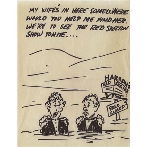 <B>Red Skelton Cartoon Drawing.</B></I> Drawn by the comedian in black marker on a sheet of paper, featuring two men up to their chests in snow outside Harrah's Casino, with the caption: "My wife's in here somewhere. Could you help me find her? We're to see the Red Skelton show tonite..." In Excellent condition.
