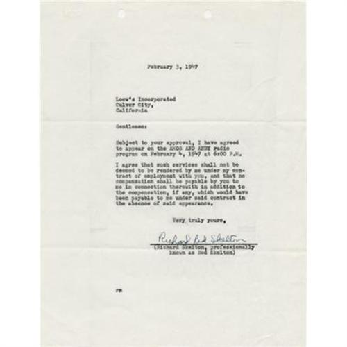 <B>Red Skelton Document Signed.</B></I> Printed agreement to appear on Amos and Andy radio program; one page 8.5" x 11", Culver City, California, February 3, 1947, signed "<I>Richard Red Skelton"</B></I>. A legendary comedian, Richard "Red" Skelton was a radio phenomenon and television pioneer famous for his comedic characters and mush-mouthed catch phrases. Besides lengthwise crease and staple holes in top left corner, document is in fine condition.<BR><BR><b>Shipping:</b> Flat Material, Small (<a target="_blank" href="http://www.heritageauctions.com/common/shipping.php">view shipping information</a>)