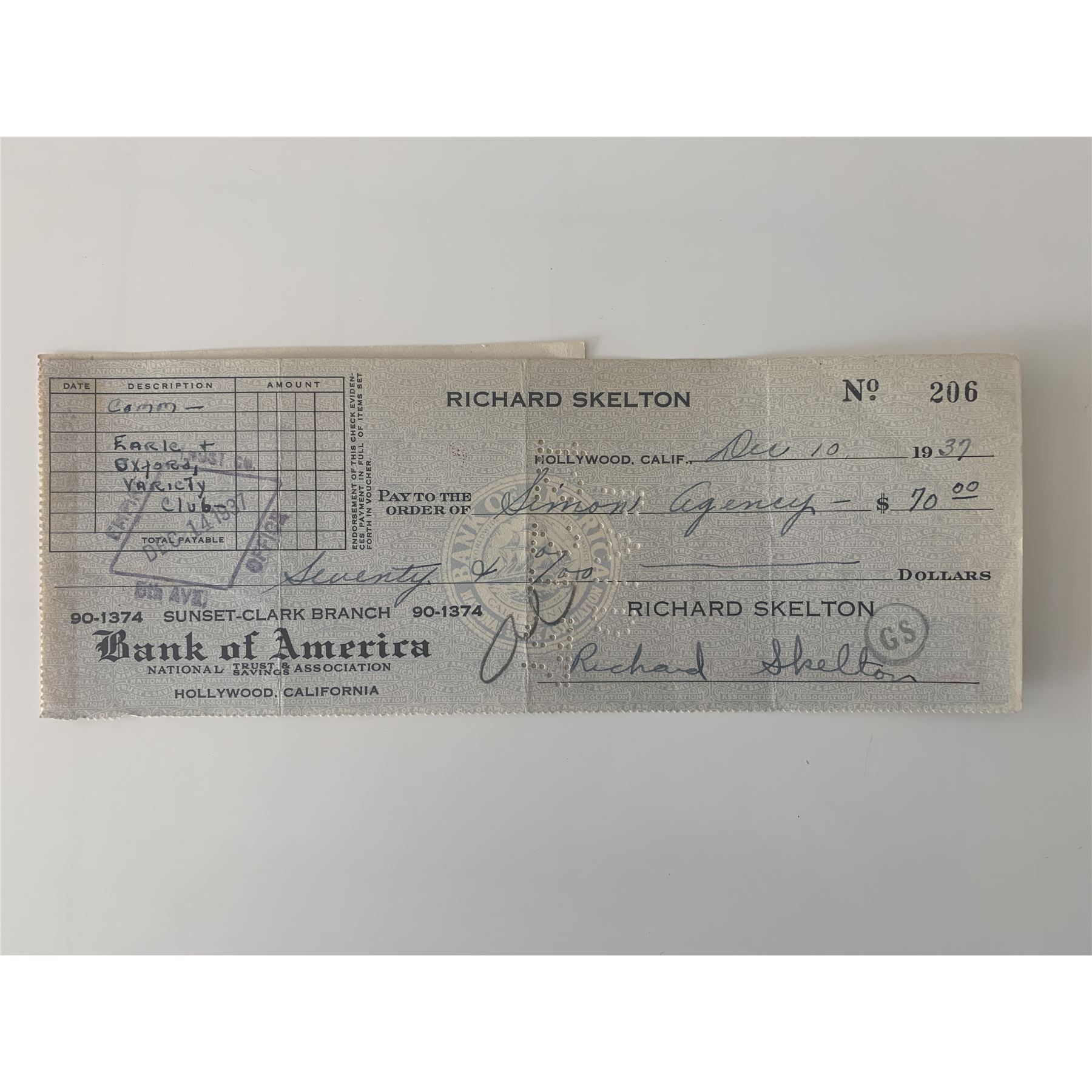 Red Skelton signed check. 3x8 Inches