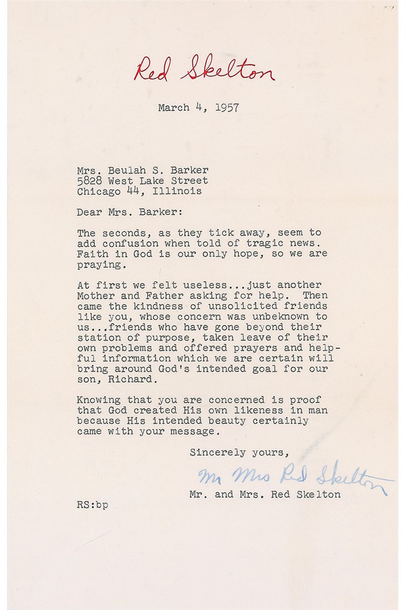 TLS signed “Mr. and Mrs. Red Skelton,” one page, 6.25 x 9.75, personal letterhead, March 4, 1957. Letter to a well-wisher. In full: “The seconds, as they tick away, seem to add confusion when told of tragic news. Faith in God is our only hope, so we are praying. At first we felt useless…just another Mother and Father asking for help. Then came the kindness of unsolicited friends like you, whose concern was unbeknown to us…friends who have gone beyond their station of purpose, taken leave of their own problems and offered prayers and helpful information which we are certain will bring around God’s intended goal for our son, Richard. Knowing that you are concerned is proof that God created His own likeness in man because His intended beauty certainly came with your message.” In fine condition. Accompanied by the original mailing envelope