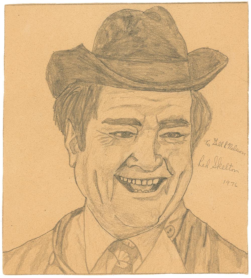 Original signed and inscribed pencil sketch of Skelton, done in an admirer’s hand, on an off-white 7.5 x 8 sheet, signed and inscribed in pencil, “To Gill R. Nelson, Red Skelton 1976.” In fine condition, with lightly trimmed edges. Pre-certified PSA/DNA and RRAuction COA.