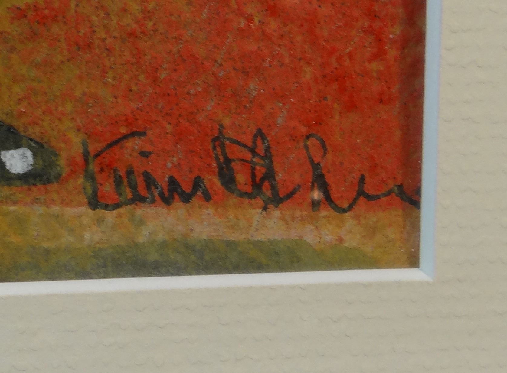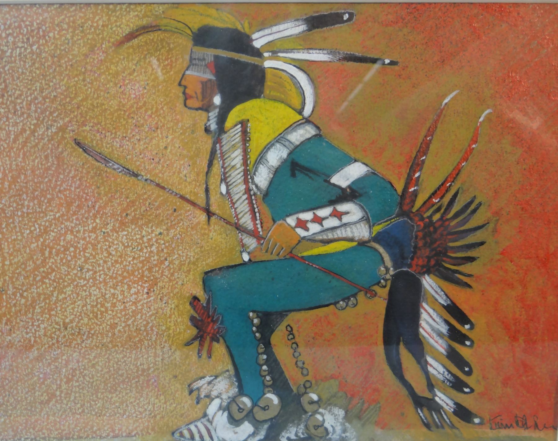 Red Star, Kevin, mixed media, 9" x 12". Born and raised on the Crow reservation in Lodgegrass, Montana, Kevin Red Star does Indian paintings that reflect the influence of his father and mother and a home filled with love of fine art. His father was a musician, horseman, and collector of Remington and Russell prints, and his mother did meticulous beadwork and artistic sewing.