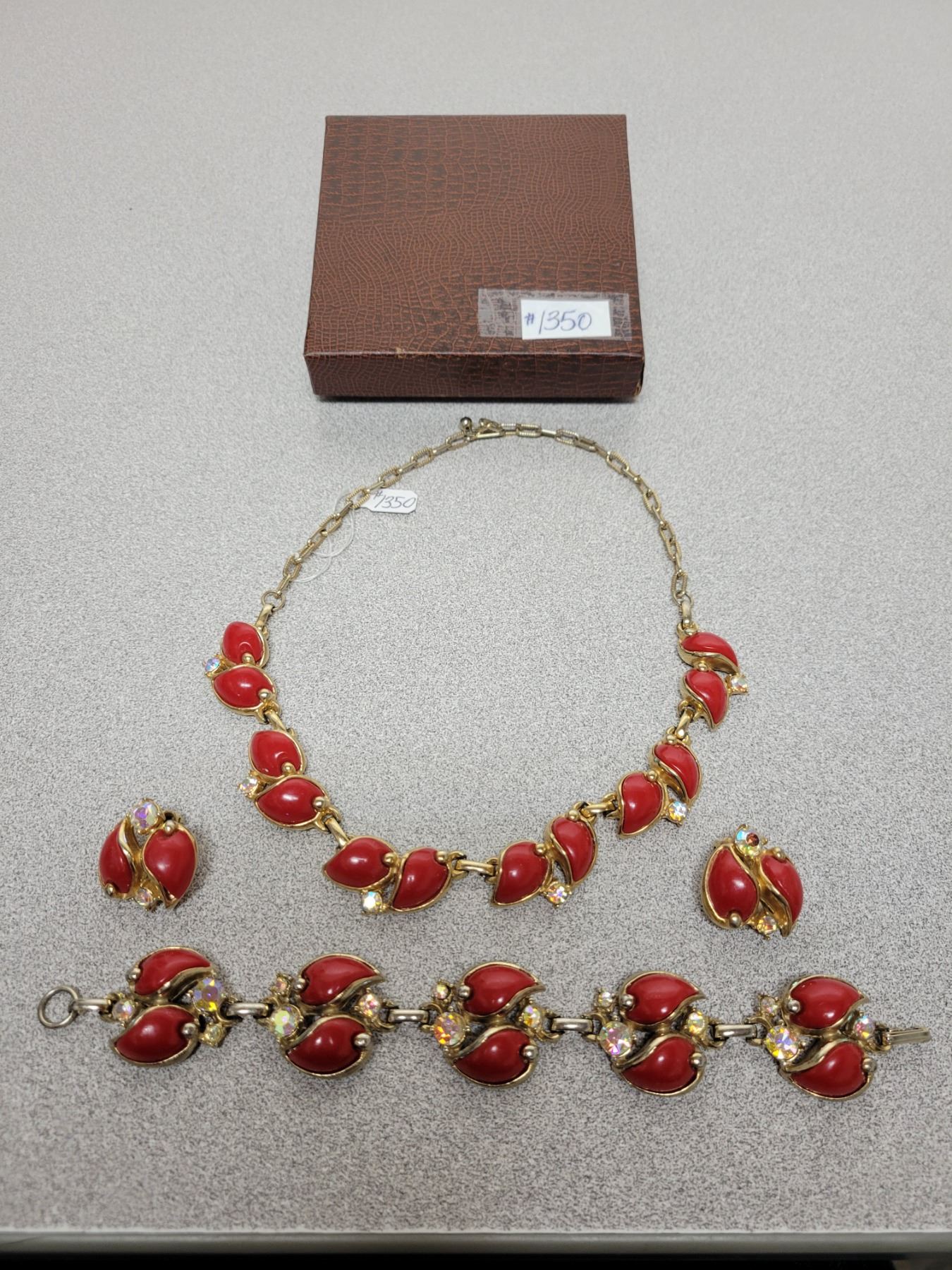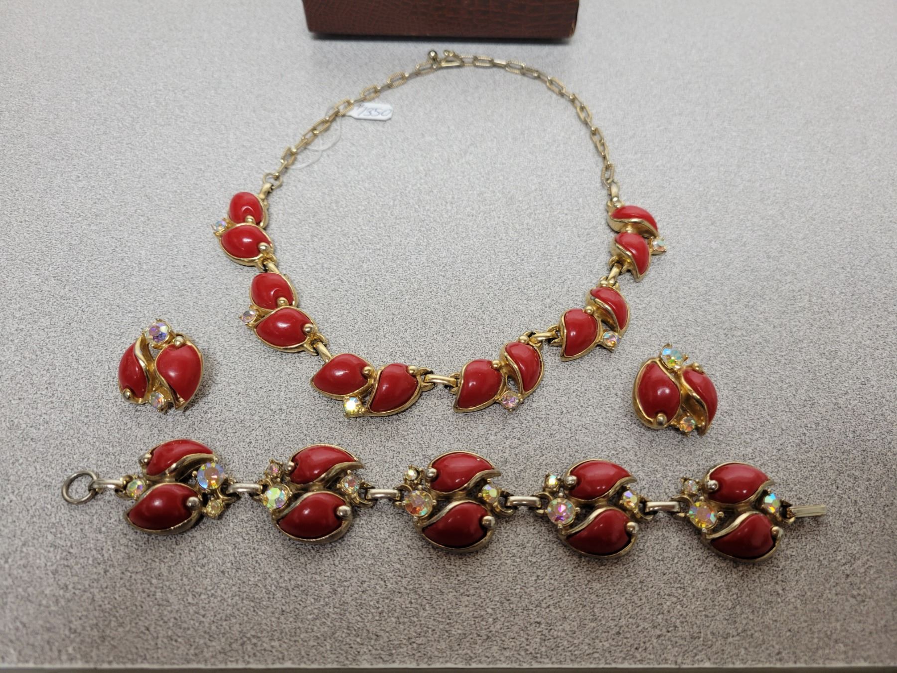 Red Thermoset and aurora borealis paraure, clip earrings, circa 1948
