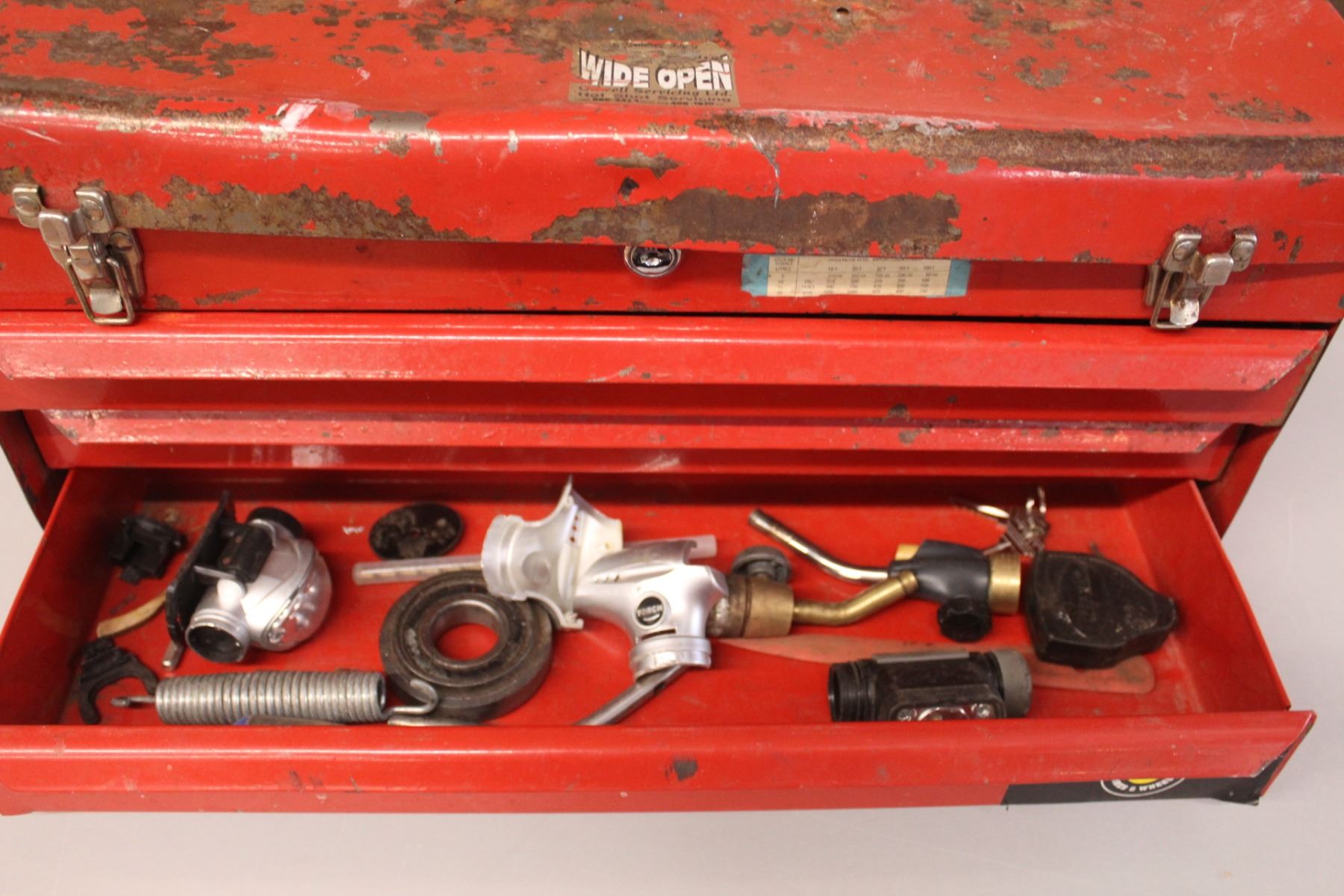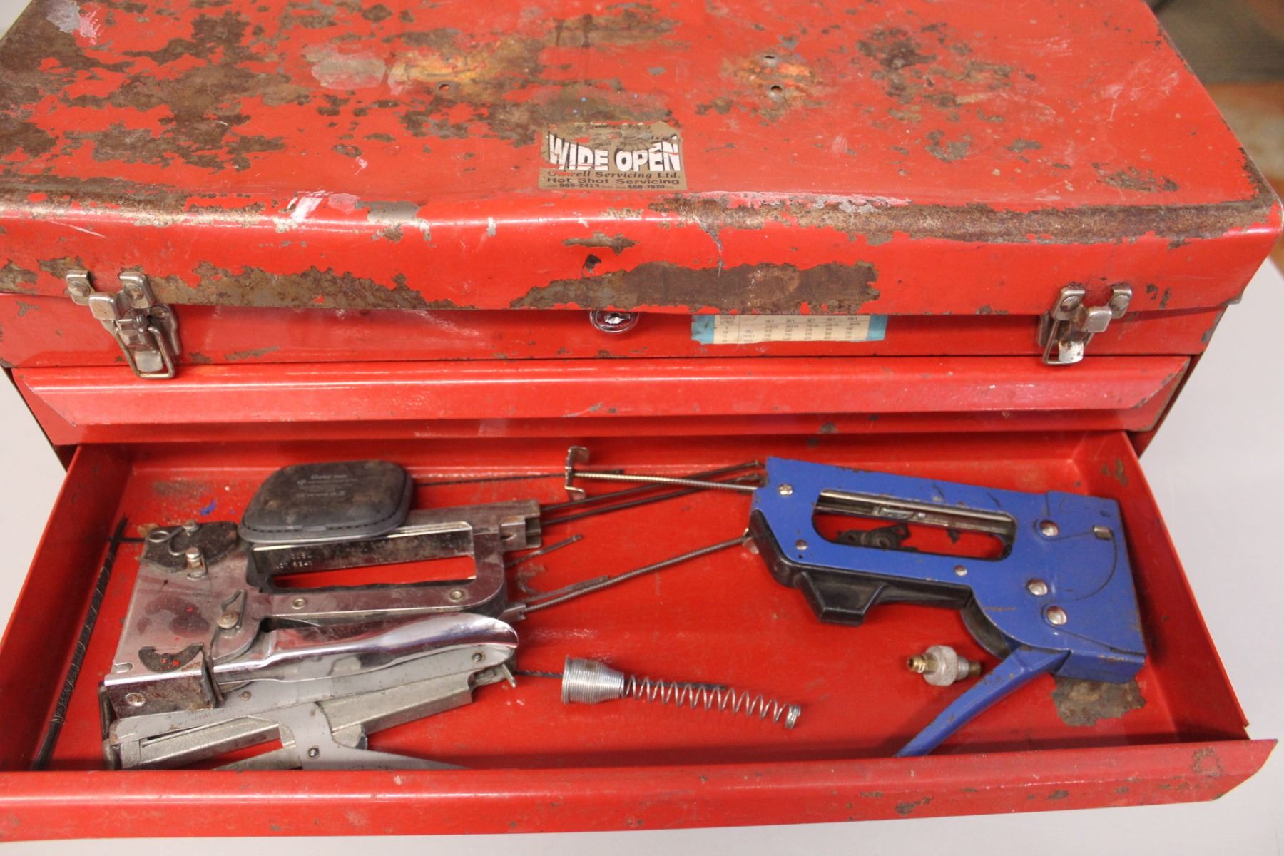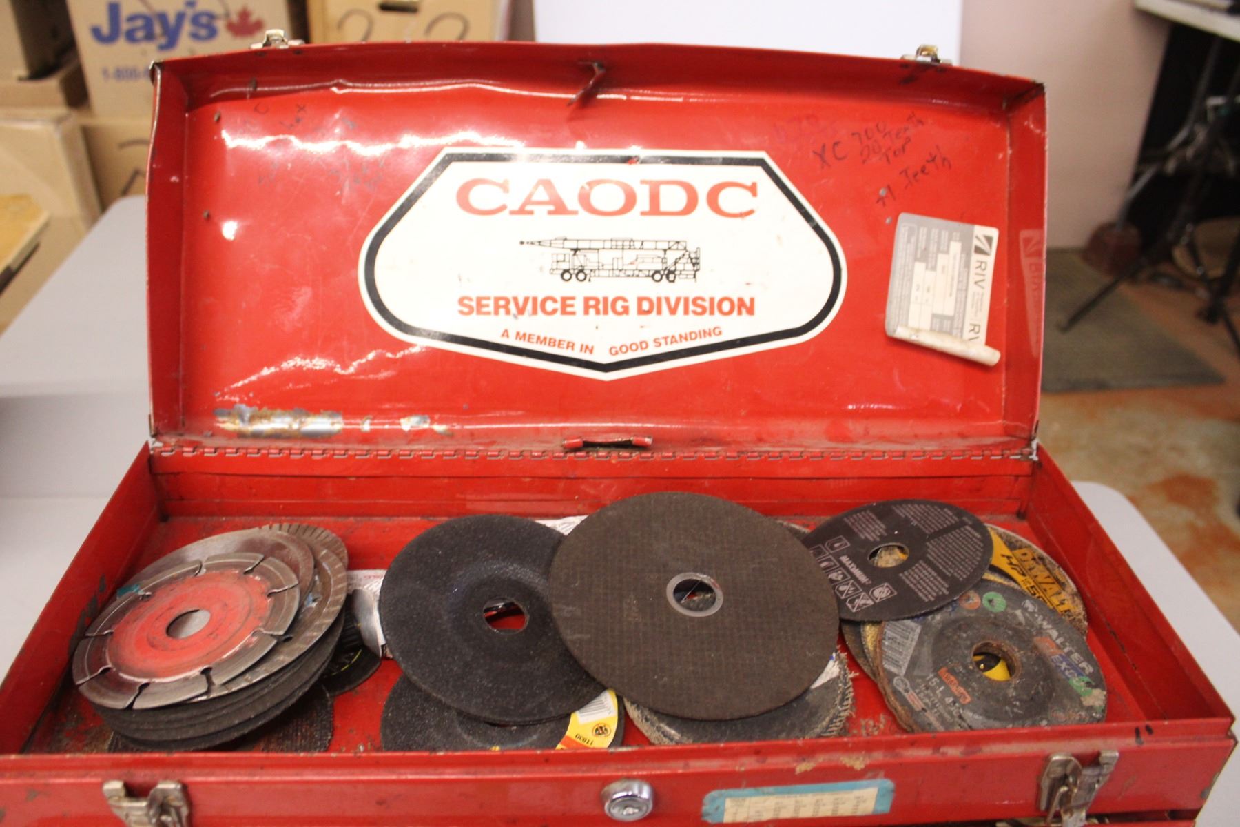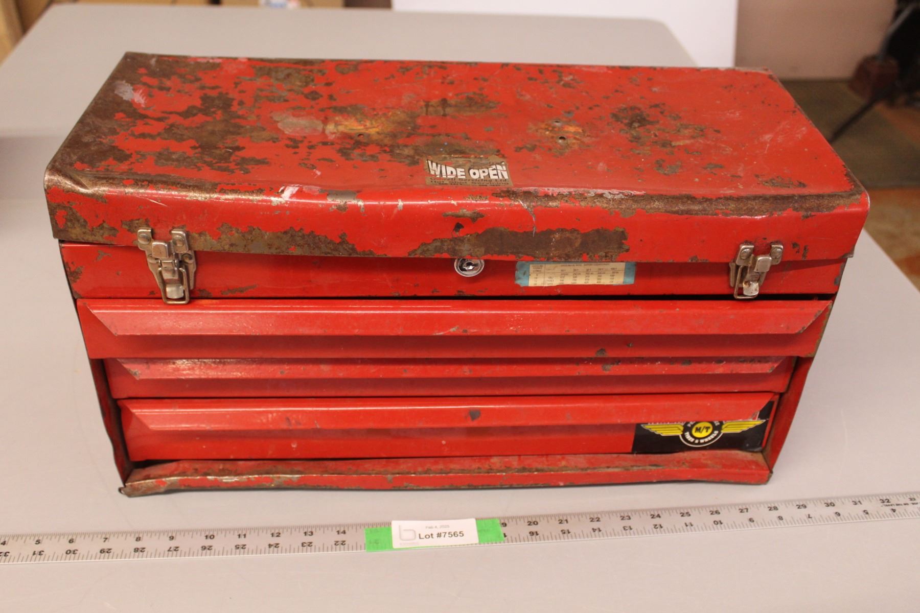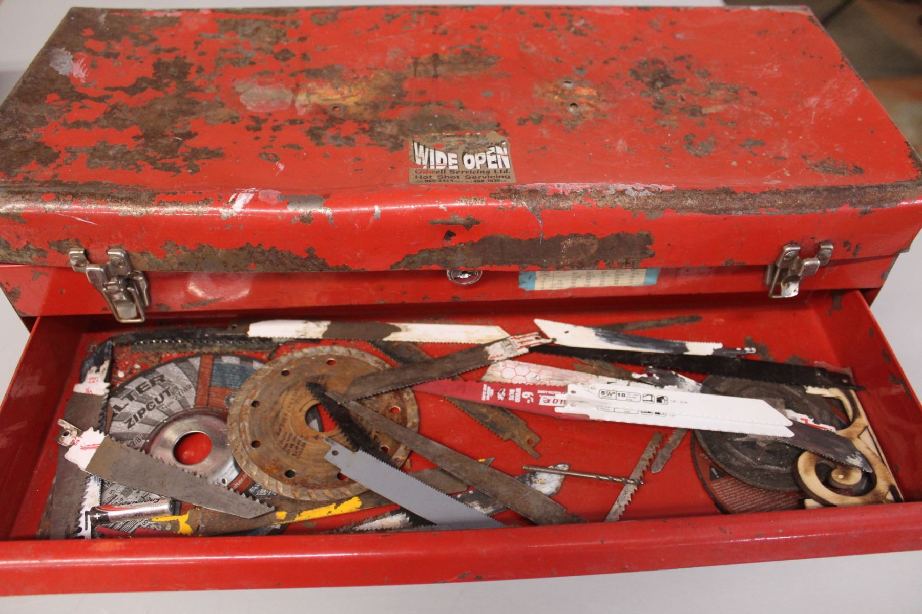Red Tool Chest, As Is 12" Tall x 21" Long with Tools- Staple Gun, Circular Saw Blades, Misc. WILL NOT SHIP