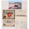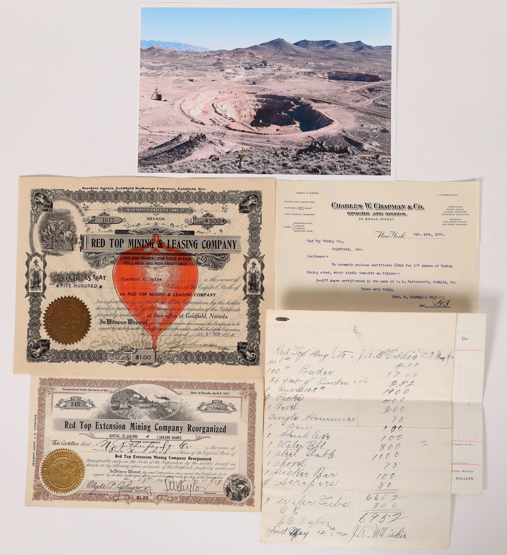 Lot of 5. 1) Very rare Red Top Mining & Leasing Company stock certificate with large vignette of a red top. No. 1672, issued for 500 shares in 1909 to Clarence Bates. Signed by the president and secretary. Not cancelled. Multiple mining vignettes and a gold seal. Pinholes, folds, some toning. 2) Red Top Extension Mining Company Reorganized stock certificate No. 245. Issued for 100 shares in 1917. Signed by president Taylor and asst. secretary Johnson. Not cancelled. Brown border and two mining vignettes. Folds. 3) Invoice attached to company billhead, 1904, for tools and lumber. Approved by CD Taylor. 4) 1906 letterhead from Charles W. Chapman & Co., Stocks and Bonds, New York, to the Red Top Mining Co. Message is about them sending a stock for transfer. 5) Modern color photo print showing the Red Top Open Pit. 7.5 x 11" Charles D. Taylor was an important mining man in Goldfield. Taylor located the second mining claim in Goldfield. He located the Jumbo, Florence, Red King and Firelight claims on October 19, 1903. (He would locate other claims later.) But it was the Jumbo and Florence that would make Taylor a millionaire. It started in the Fall of 1903 when a rich pocket of gold was discovered while doing location work on the Jumbo. According to Church & Carpenter the Jumbo yielded $1,371,165 between 1904 and 1909 and the Florence over $6,000,000. The Florence was located in MIlltown and the Jumbo in Jumbotown. These were two early suburbs of Goldfield. He later became associated with the Red Top Mine. The Red Top was consolidated with other Goldfield properties under the Goldfield Consolidated Mines Company. Goldfield Nevada