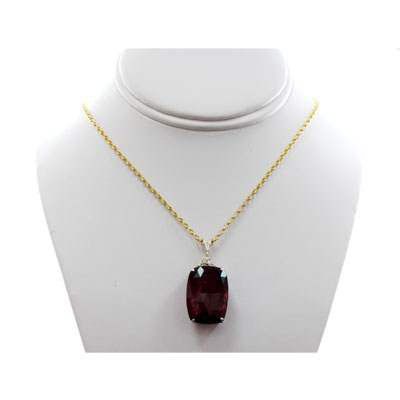 Red Tourmaline 53.34 ctw & Diamond Pendant 14kt **|**|** Mainstone: Red Tourmaline ; Total CTW: 53.34 ; Metal Purity: 14kt ; Diamond Count: 3 Round ; Clarity: SI2 ; Diamond Color: G-H ; Gem Count 1: 1 Cushion Cut ; MSRP: $14777