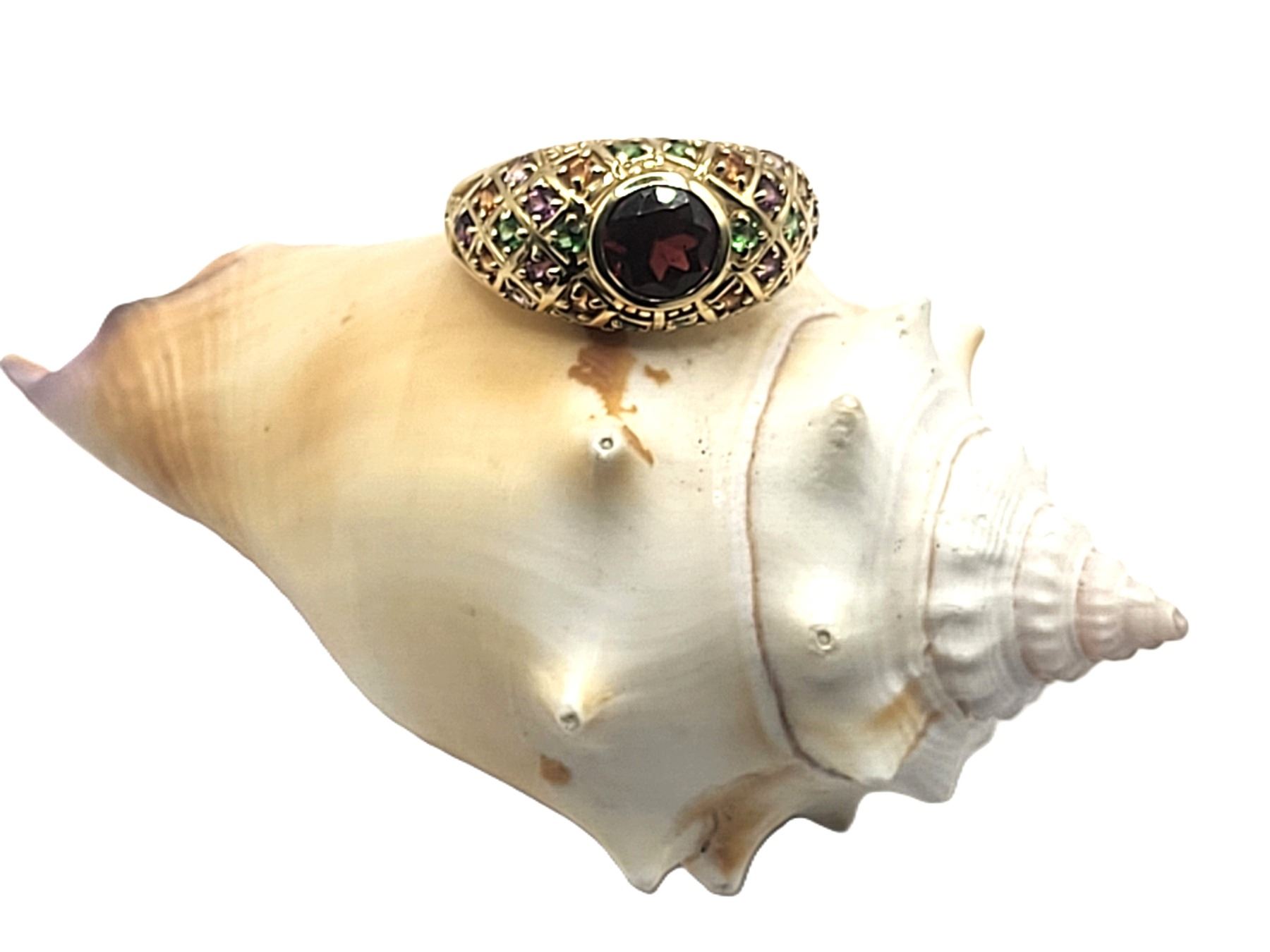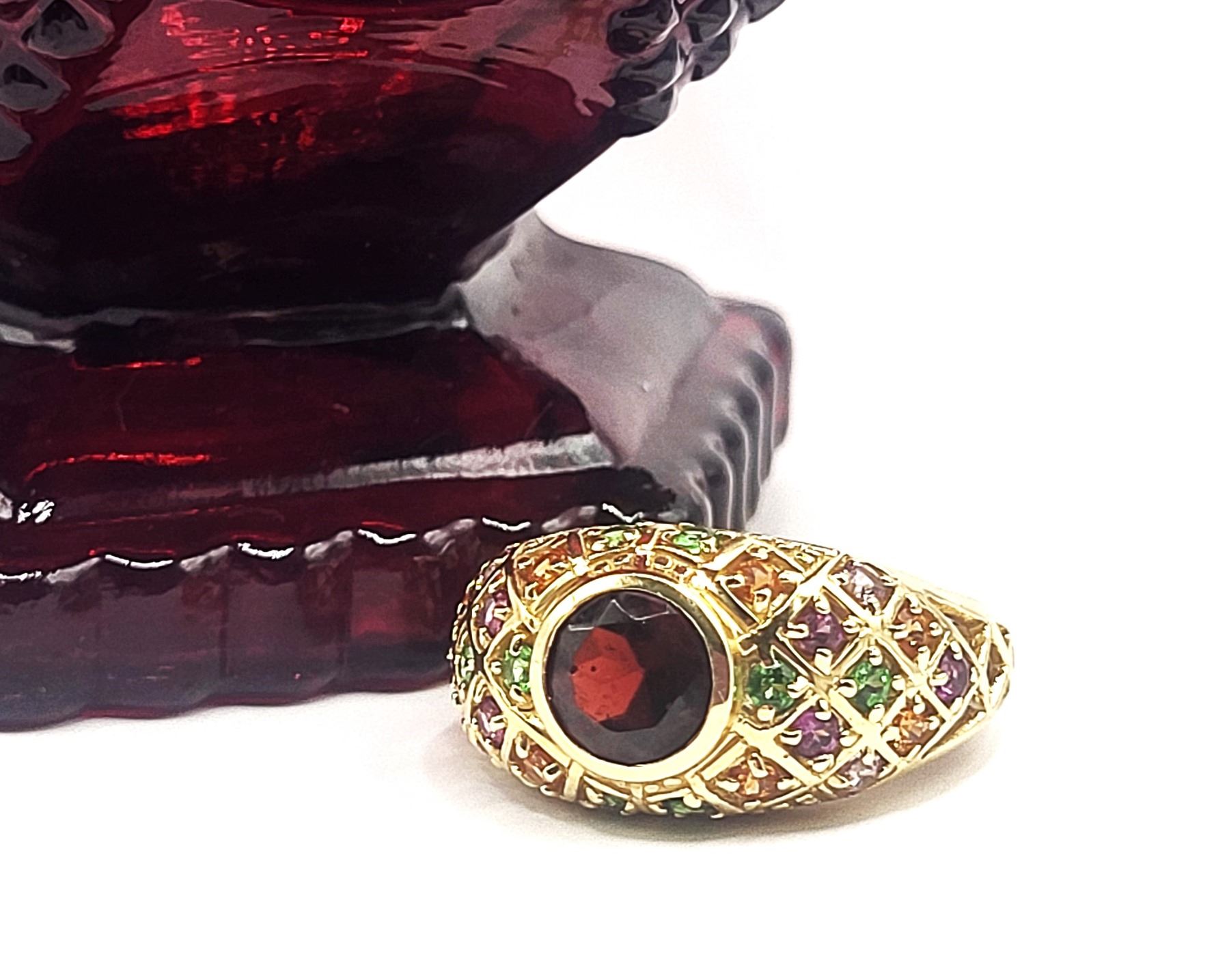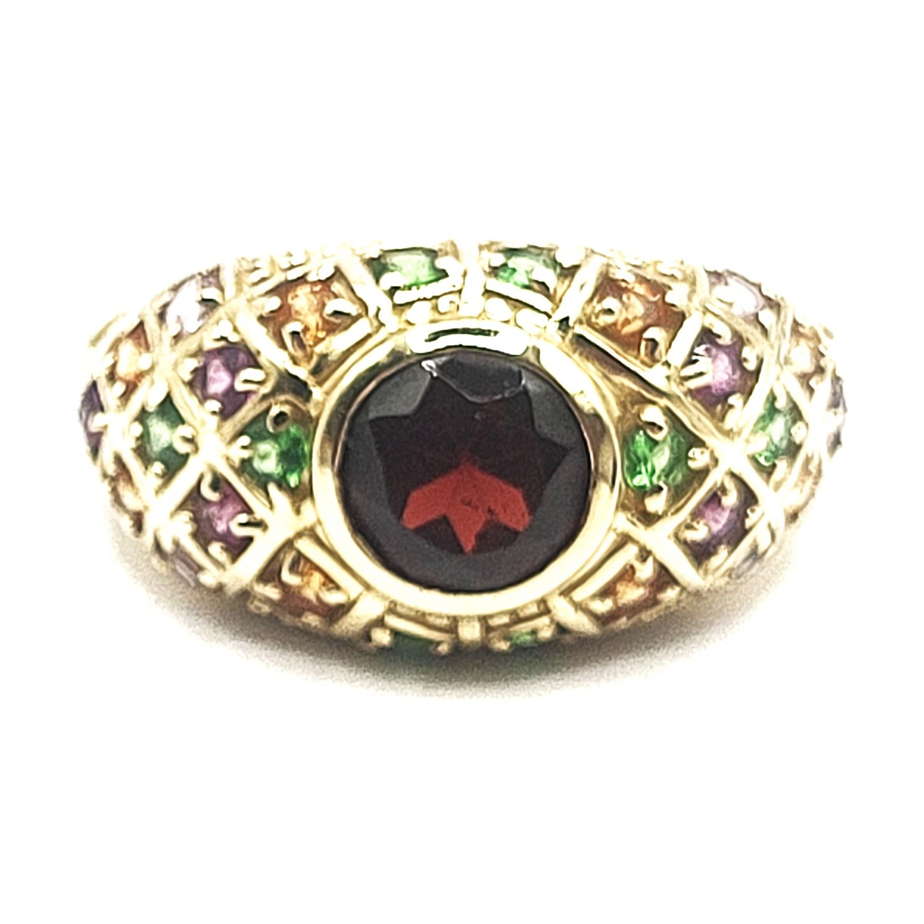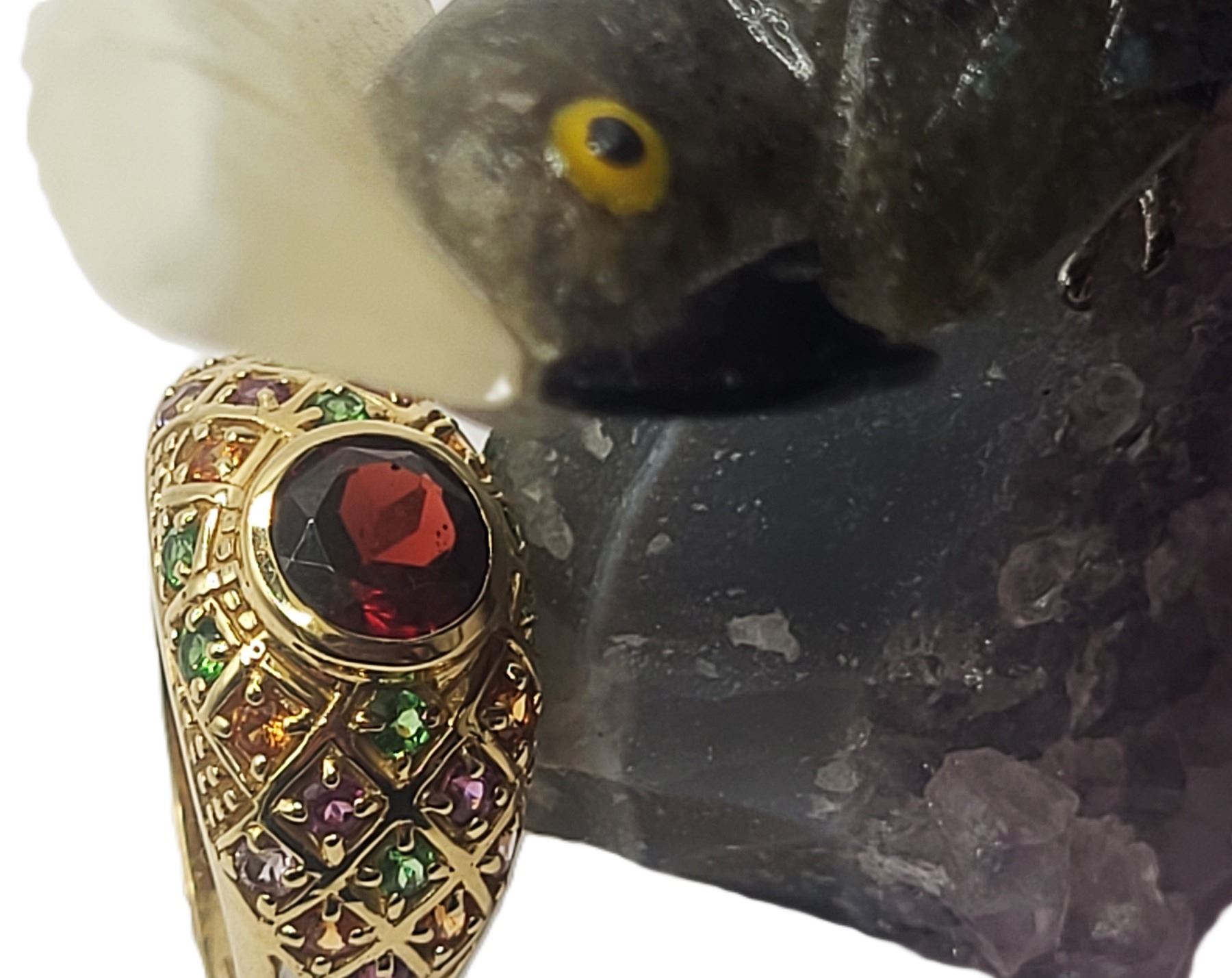 This 14 karat yellow gold features an approximate 1.30 carat round, faceted, genuine red tourmaline, also called Rubellite, that is bezel-set with approximately 1.30 carats total weight pink, green, purple, and golden tourmaline that are along the bridge and shoulders in geometric designs with bead accents. This ring is US size 8 and can be sized for an additional charge. . Admin:33110/26lrr