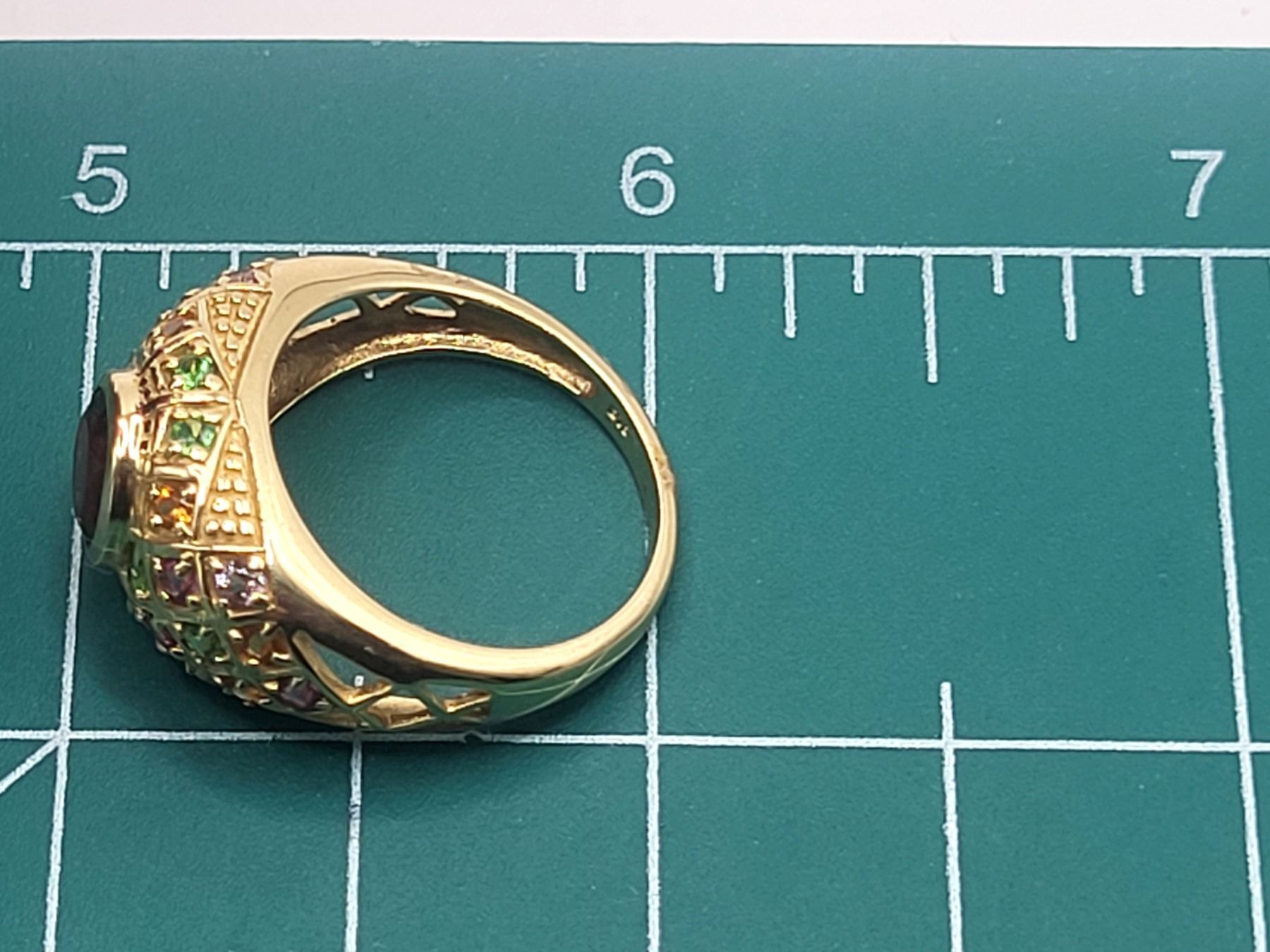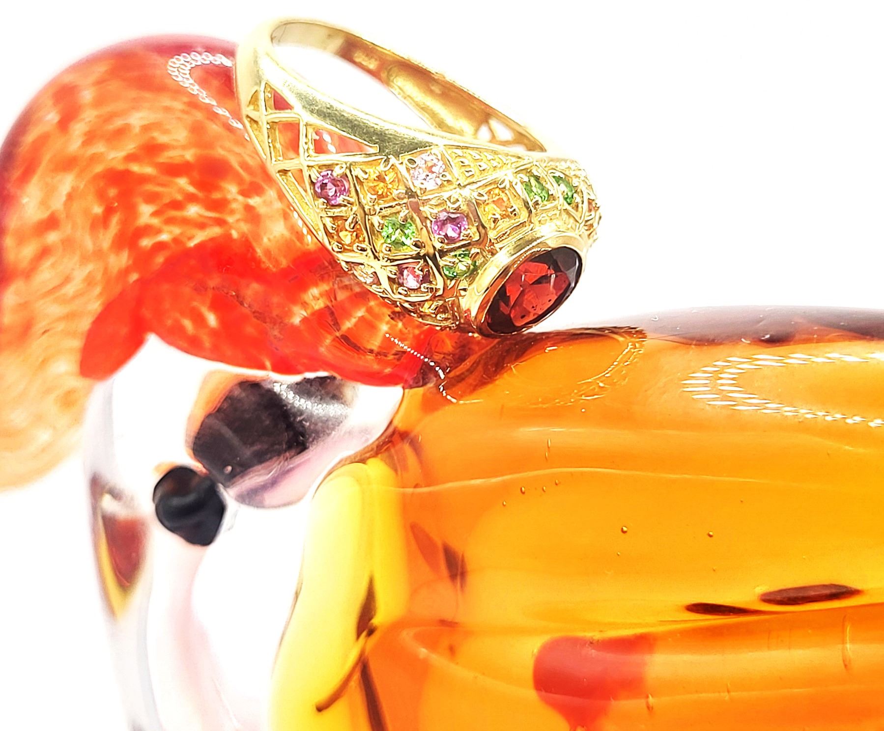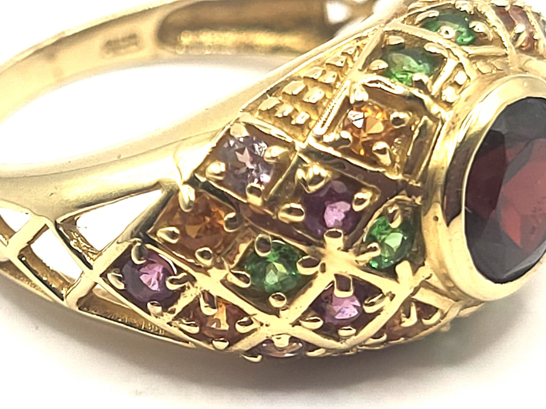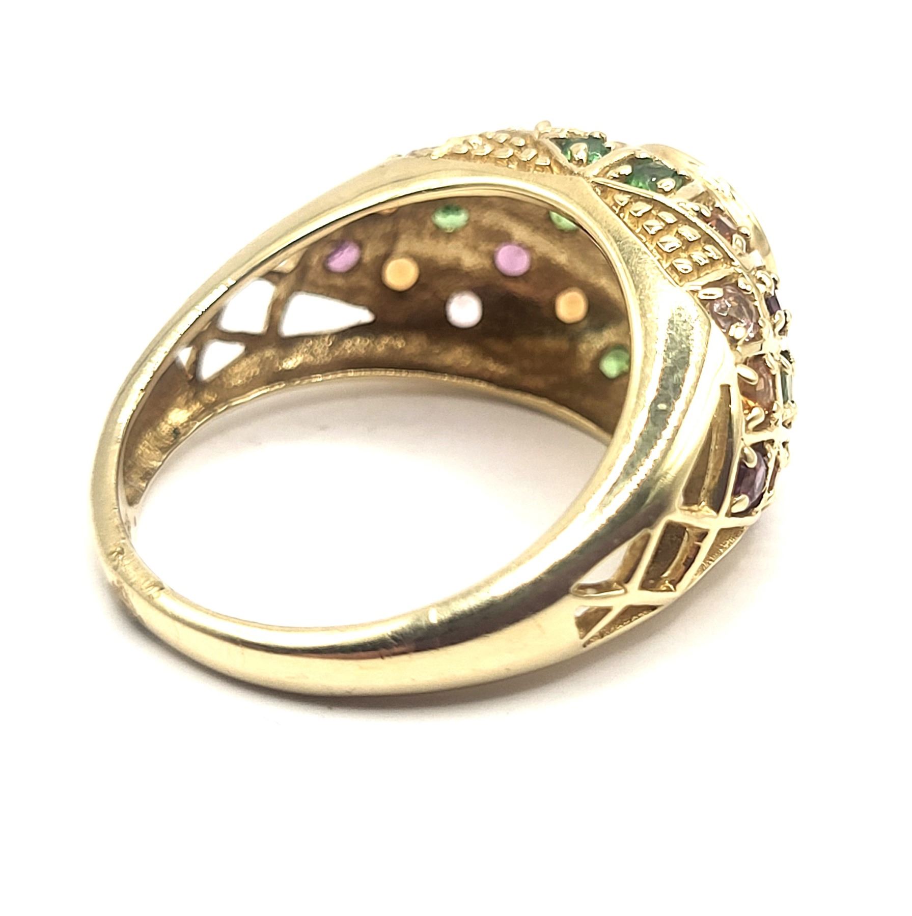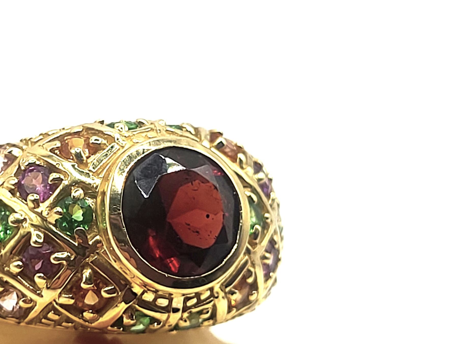 This 14 karat yellow gold features an approximate 1.30 carat round, faceted, genuine red tourmaline, also called Rubellite, that is bezel-set with approximately 1.30 carats total weight pink, green, purple, and golden tourmaline that are along the bridge and shoulders in geometric designs with bead accents. This ring is US size 8 and can be sized for an additional charge. . Admin:33110/26lrr