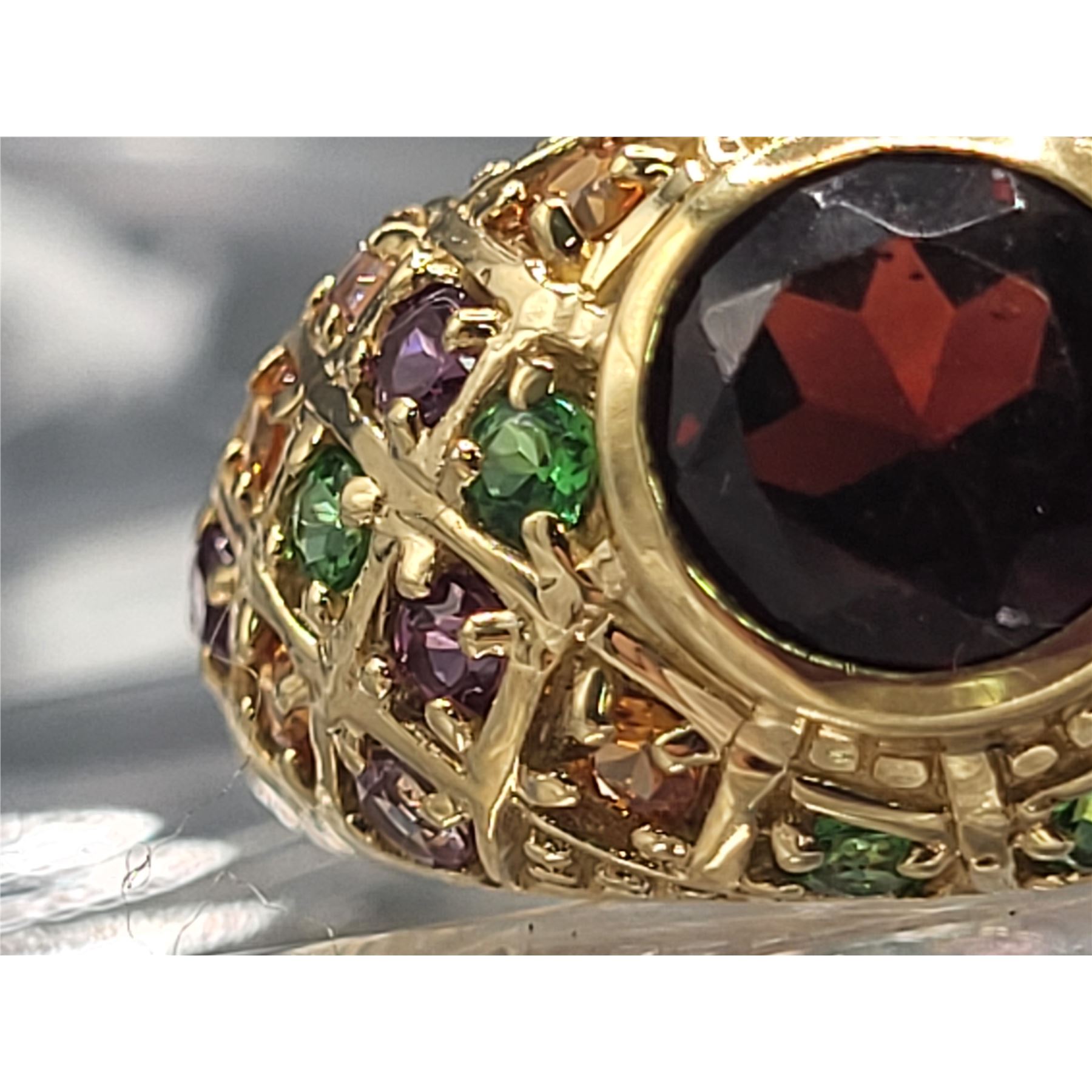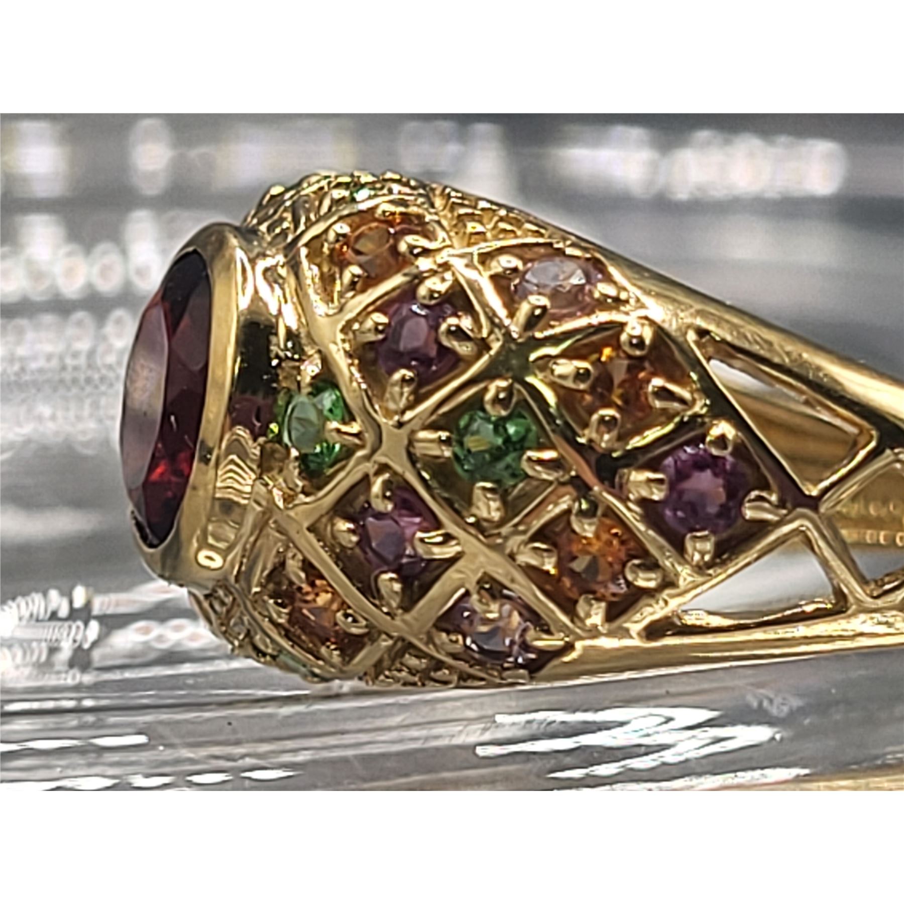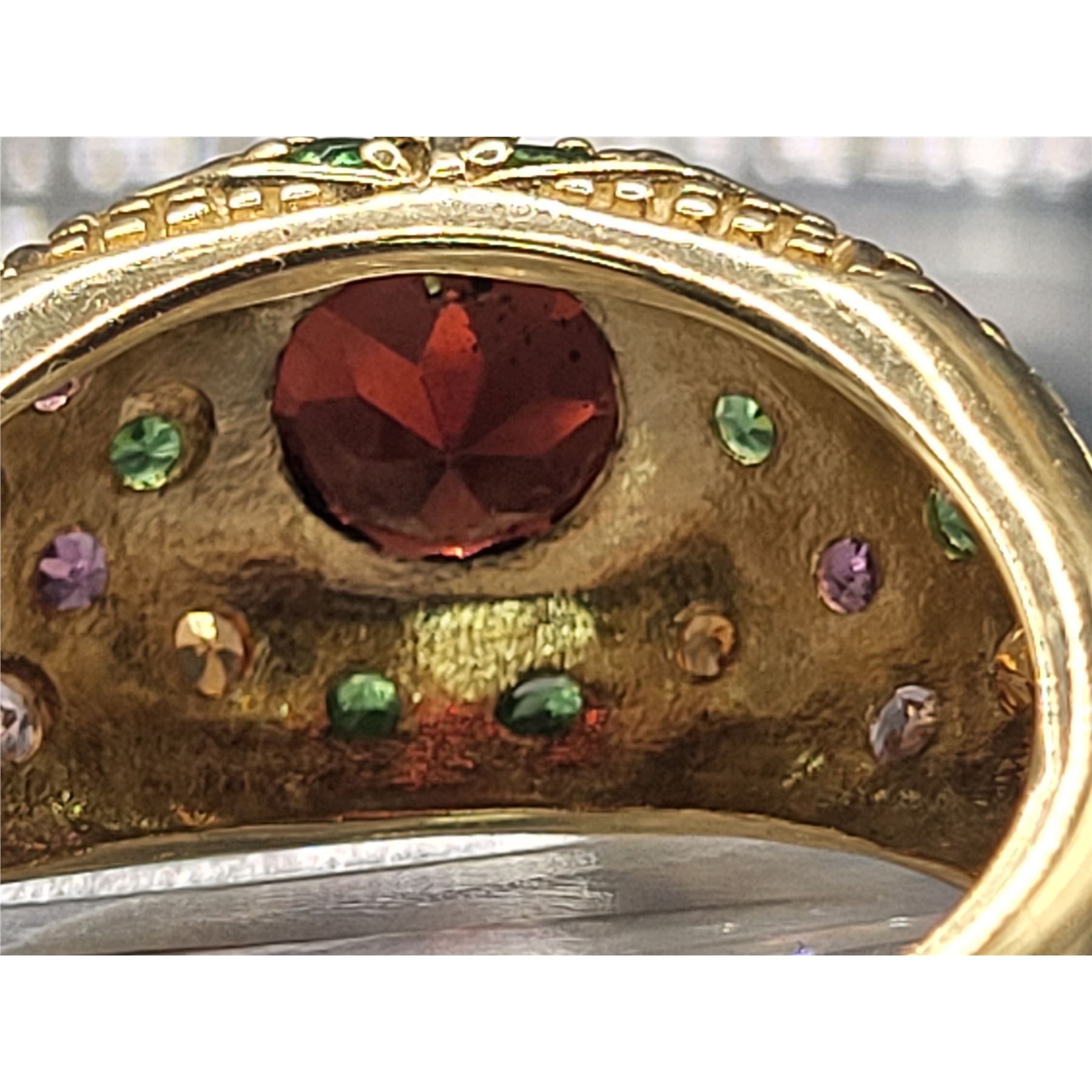This 14 karat yellow gold features an approximate 1.30 carat round, faceted, genuine red tourmaline, also called Rubellite, that is bezel-set with approximately 1.30 carats total weight pink, green, purple, and golden tourmaline that are along the bridge and shoulders in geometric designs with bead accents. This ring is US size 8 and can be sized for an additional charge. . Admin:33110/26lrr