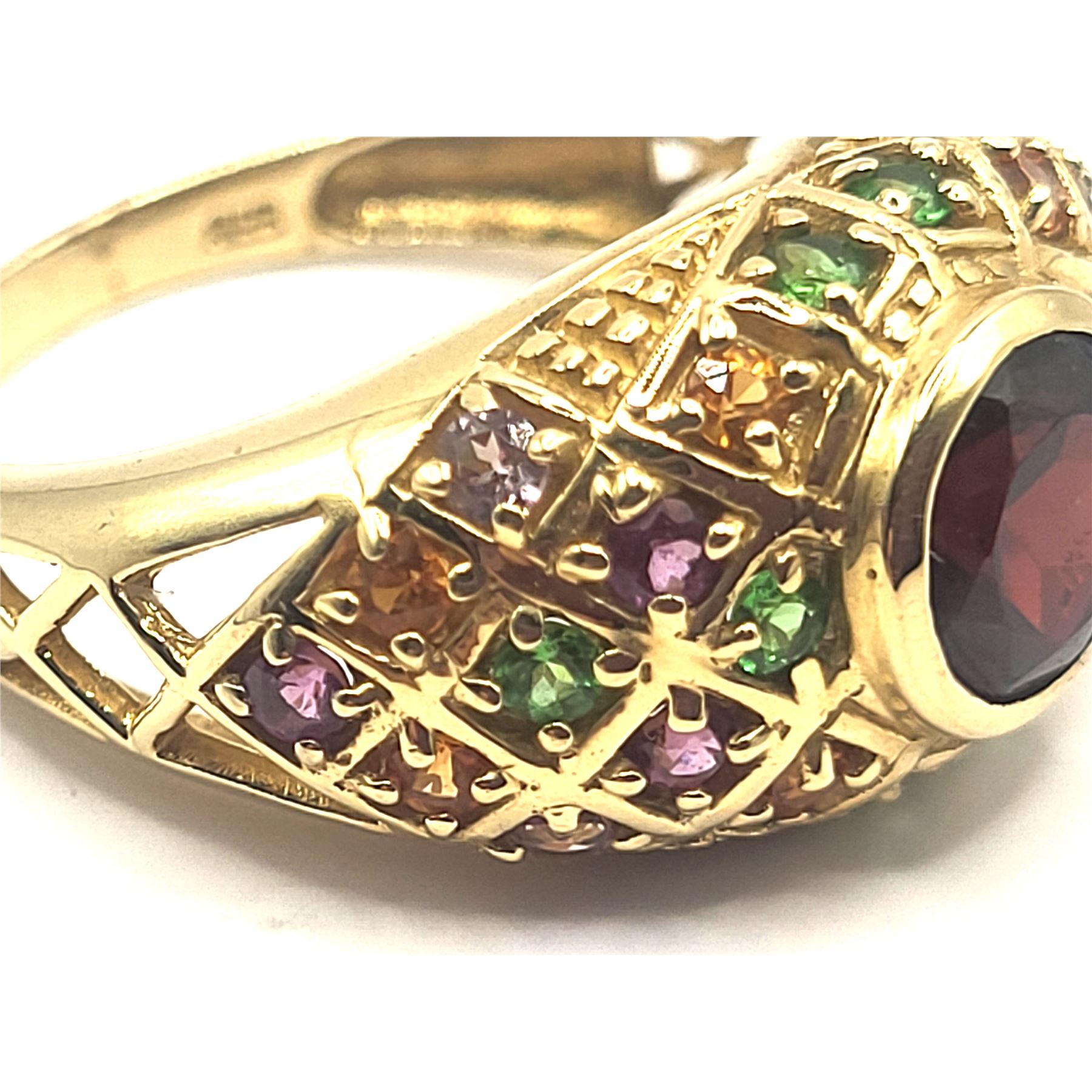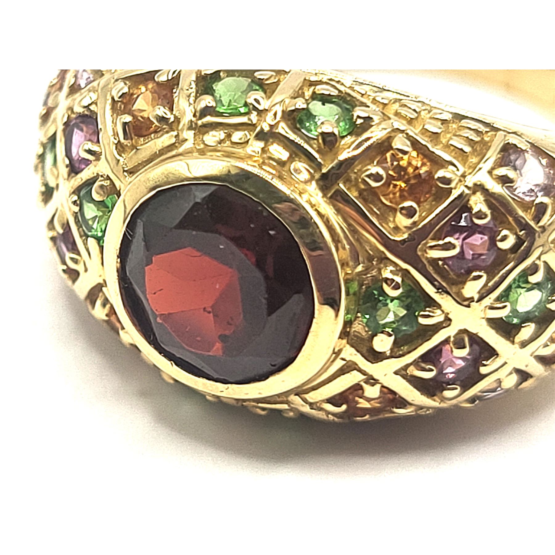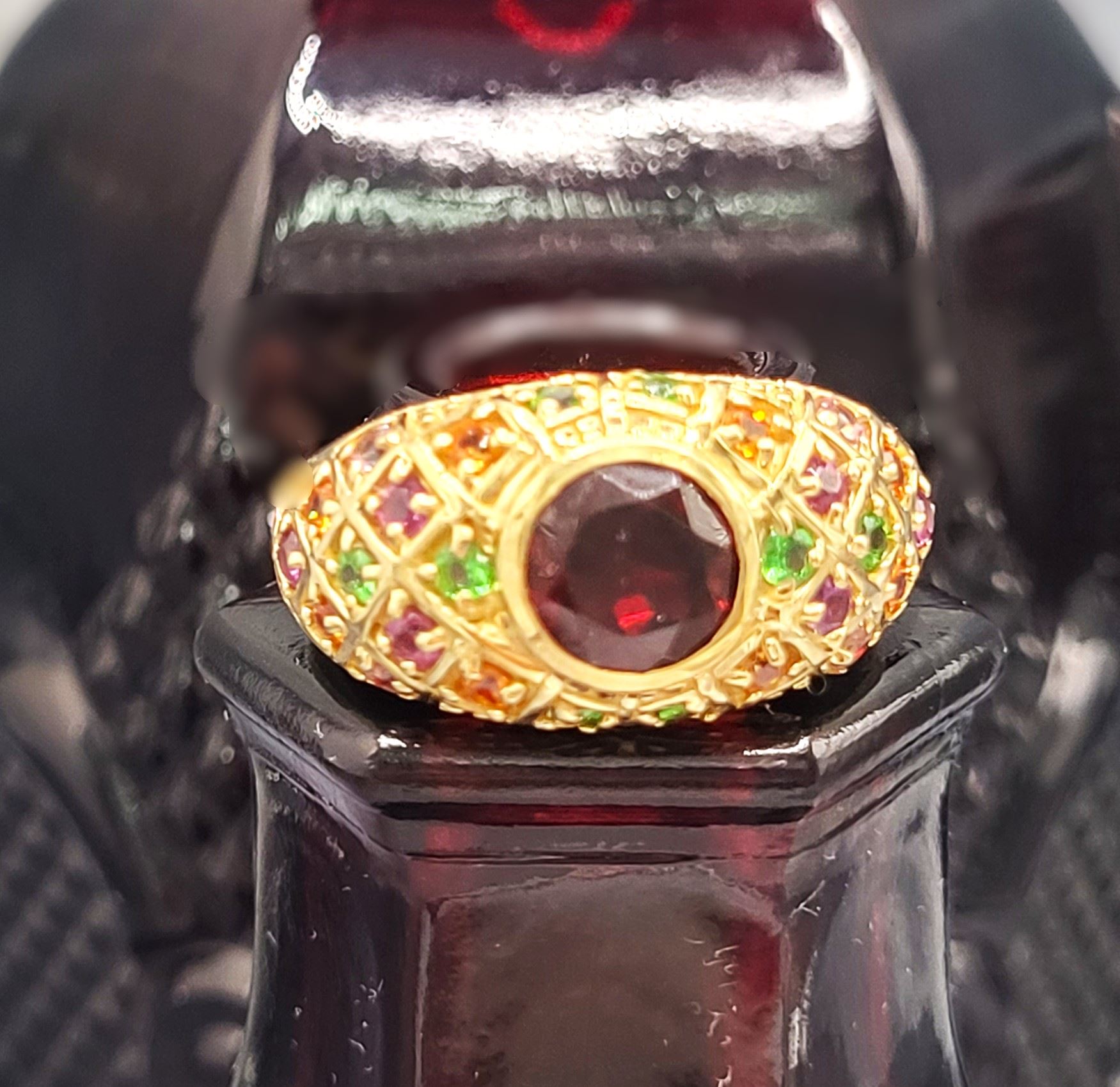 This 14 karat yellow gold features an approximate 1.30 carat round, faceted, genuine red tourmaline, also called Rubellite, that is bezel-set with approximately 1.30 carats total weight pink, green, purple, and golden tourmaline that are along the bridge and shoulders in geometric designs with bead accents. This ring is US size 8 and can be sized for an additional charge. . Admin:33110/26lrr