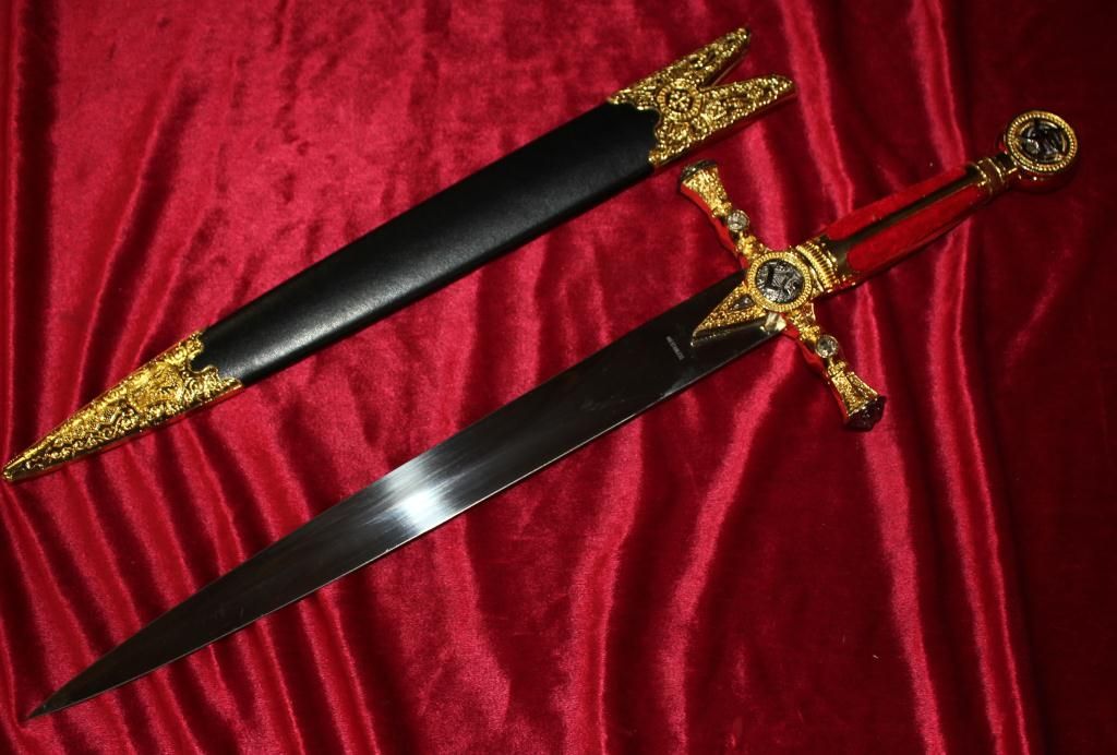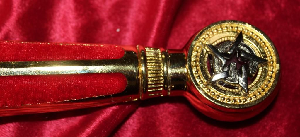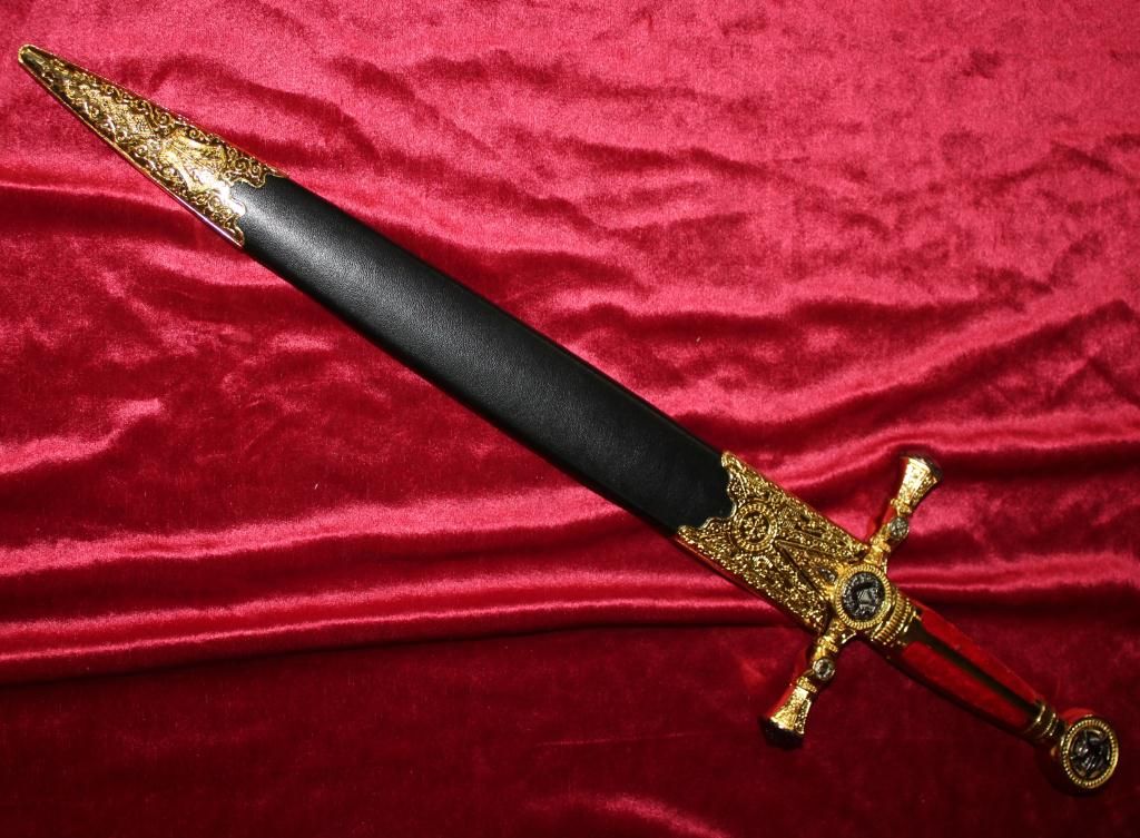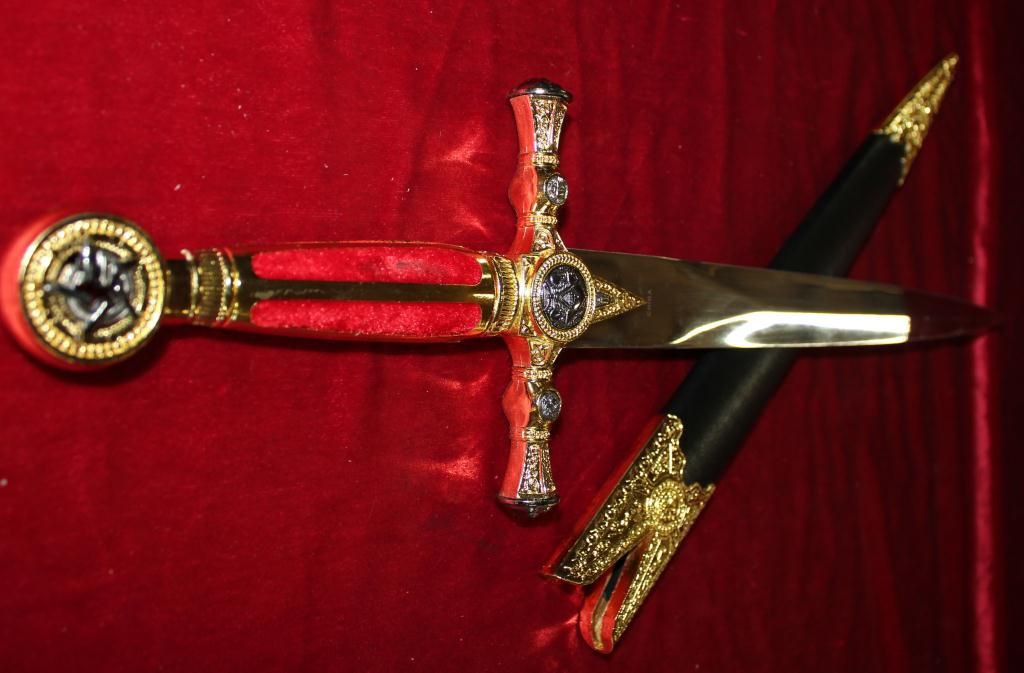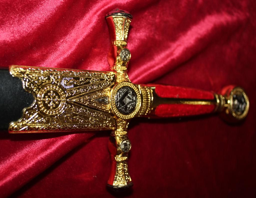 21" Overall Length. Ornate Gold Trim With Symbols. Black Sheath With Gold Trim. Stainless Steel Blade