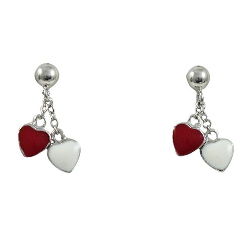 Red & White Enamel Hearts Dangling, Sterling Silver Post Earrings