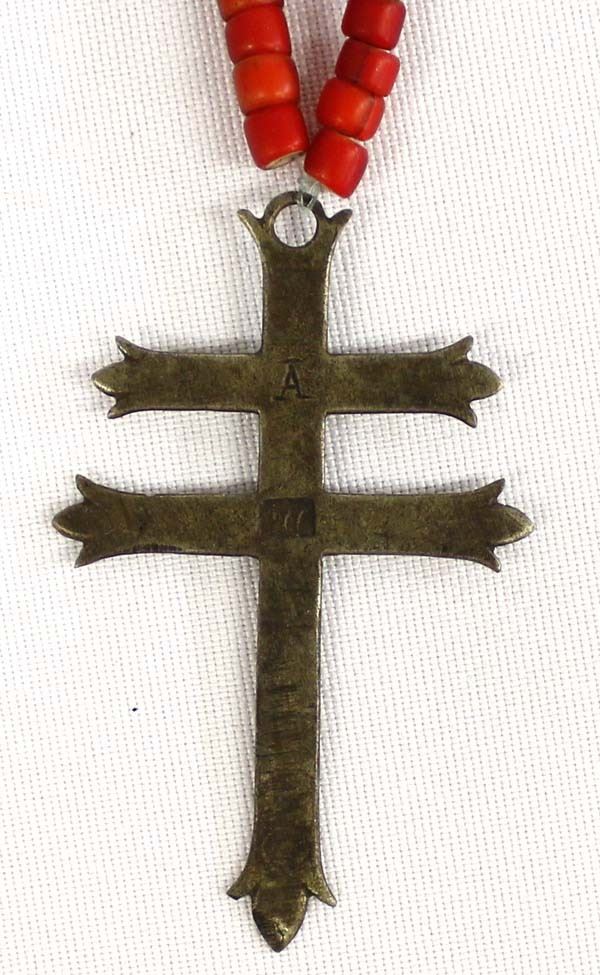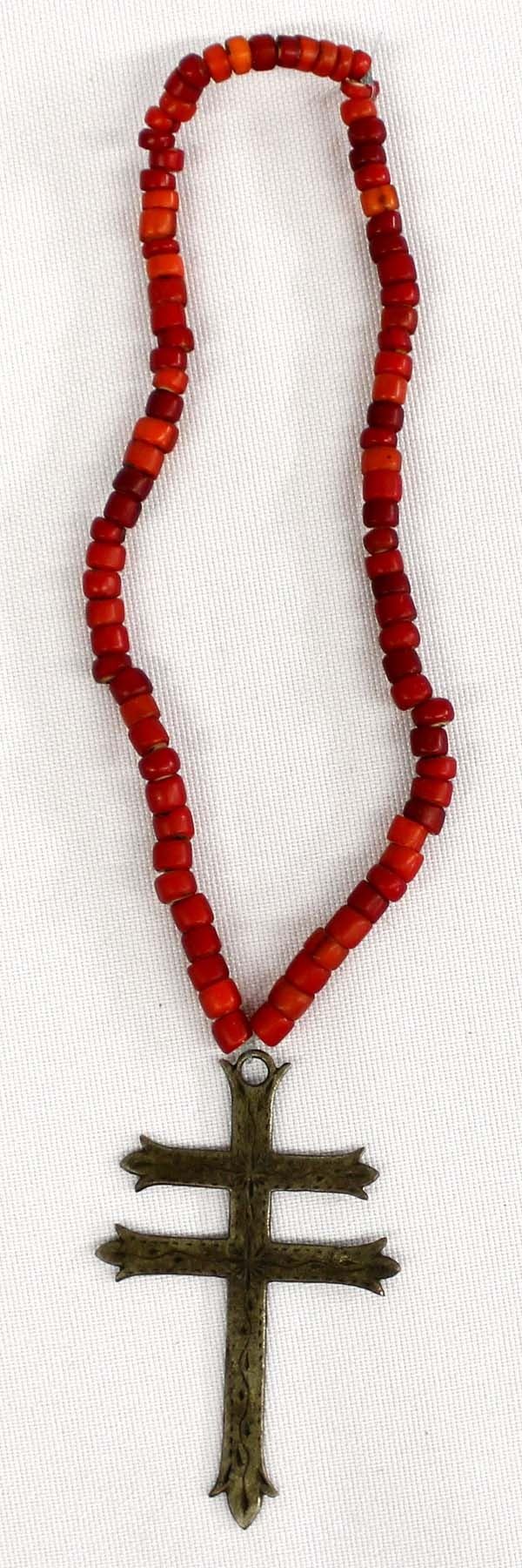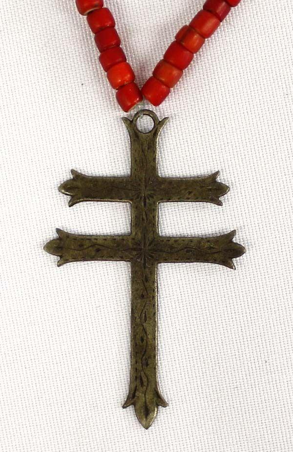 Antique/Vintage Red & White Heart Trade Bead & Cross of Lorraine Indian Fur Trade Silver Pendant Necklace, beads measure 10''L end to end and cross pendant measures 2.25''L x 1.5''W, hand stamped details on the front, initial A on the back, initial W on back, and the bottom hallmark is a C, ca. early 1800's or older