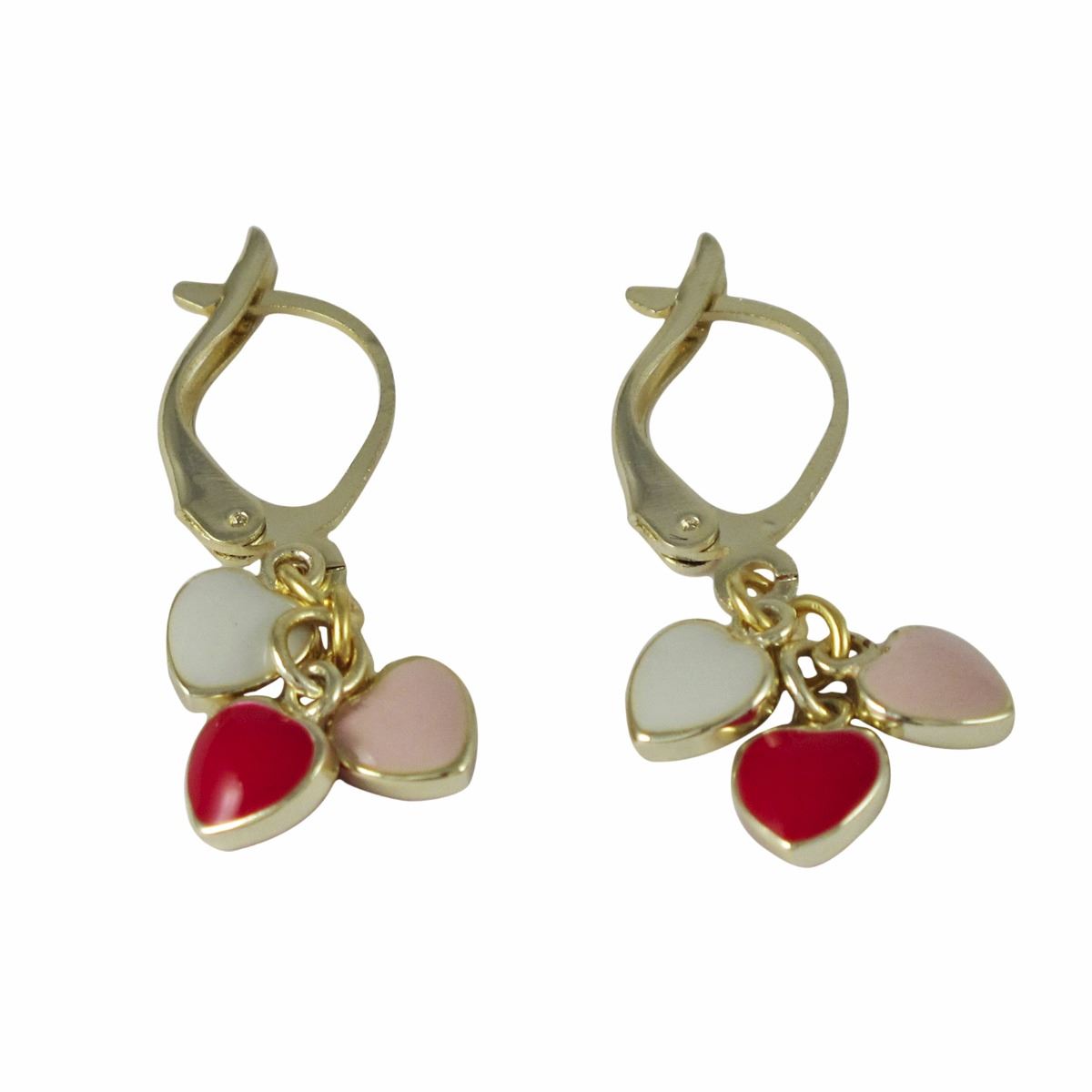 Red - White - Lt. Pink Enamel Hearts Dangling On A Gold Plated Brass Lever Back Earrings 28Mm