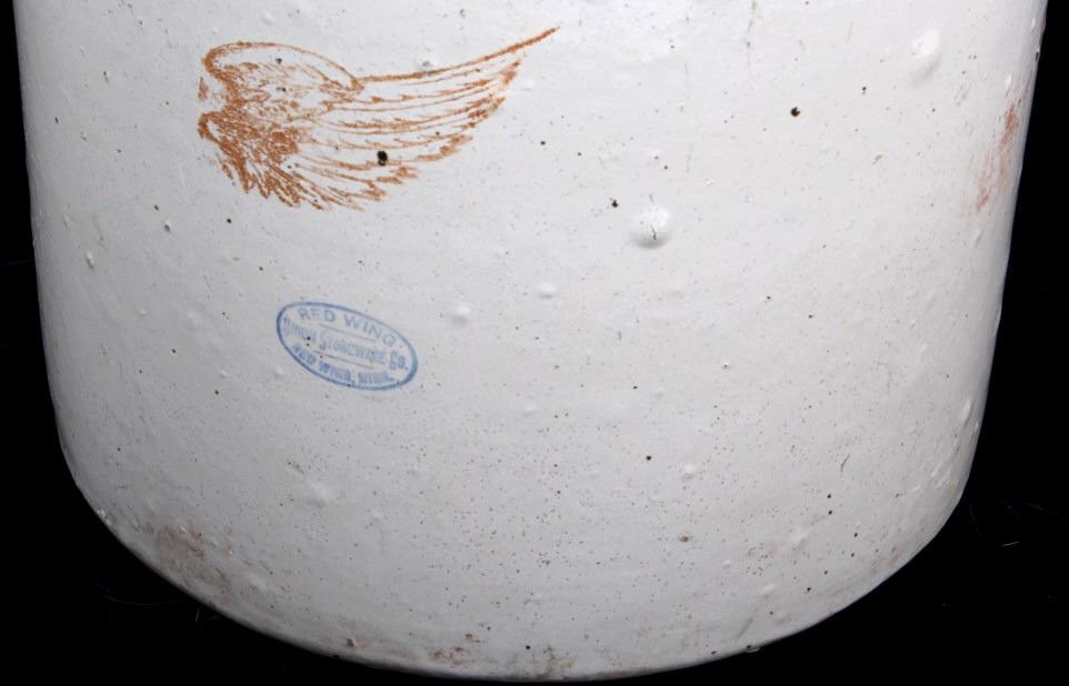 The lot features a good condition Red Wing Union Stoneware 15 Gallon crock with the rare large wing and number on the front. The front shows great paint and no visible cracks. Measures 18" D x 19" H