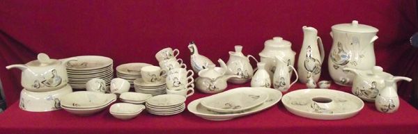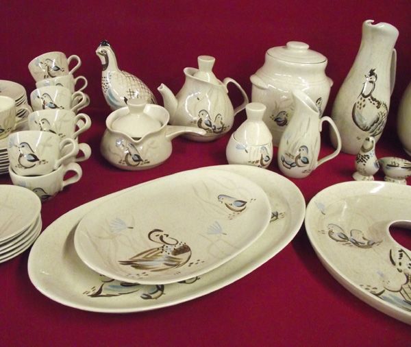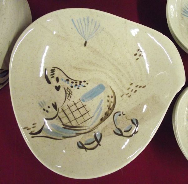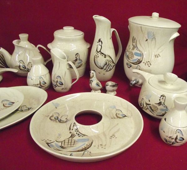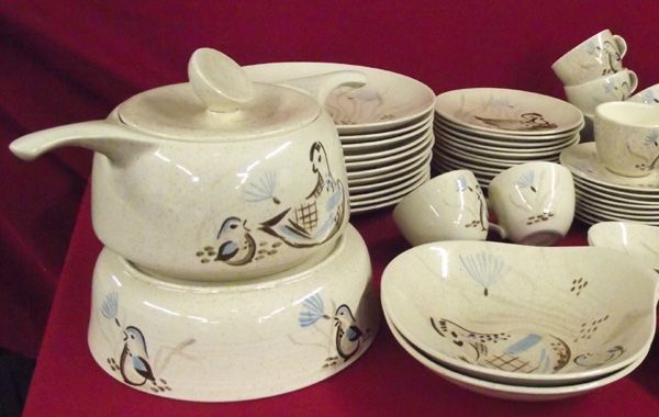 Red Wing Ceramic Dinnerware Set ''Bob White''. Red Wing ceramic dinnerware is handpainted USA made. Each piece says on the bottom, ''Red Wing USA'' and has the item number on it. This set includes the following: 12 cups, 9 saucers; 6 6.5'' plates; 11 7.5'' plates; 11 10.5'' plates; 1 water pitcher; 2 sugar bowls (one has rim chip) with lids; 1 tea server (inner rim is badly chipped); 1 lazy susan platter and 4 sauce bowls; 1 cookie jar (chip on outer rim); 1 cream pitcher; 1 pair salt & pepper shakers (chip on top of one and tail of one); 1 hors d'ouerve quaill (has holes on body for toothpicks); 1 13'' platter (chip on edge) and 1 20'' platter; 1 gravy boat with lid (inside rim chipped and handle has been glued); 2 lidded casserole dishes (one has a glued handle) and a stand for either dish; 2 9.5'' Nappy bowls; Water/beverage dispenser with lid and a nozzle at the bottom - 13''H x 9.75''W. This set MUST BE PICKED UP - it cannot be shipped.
