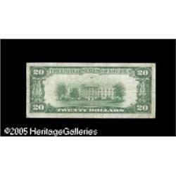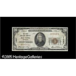 <B>Red Wing, MN</B></I>- $20 1929 Ty. 1 <B>The First NB</B></I> Ch. # 1487 <B>Fine-Very Fine.</B></I> This is one of just three Series 1929 National Bank Notes reported to date with mismatched serial numbers, and the only one with a multiple digit mismatch. The left serial number is B000221A and the right B000187A. It was discovered several years ago by a collector who had owned it for many years without ever examining its serial number, and was pleasantly shocked to discover that his long held note was actually a mismatched serial example. Our consignor purchased this item in our January, 2002 sale for $69,000, a number that is certainly possible but not likely reachable this evening. Lot:15031