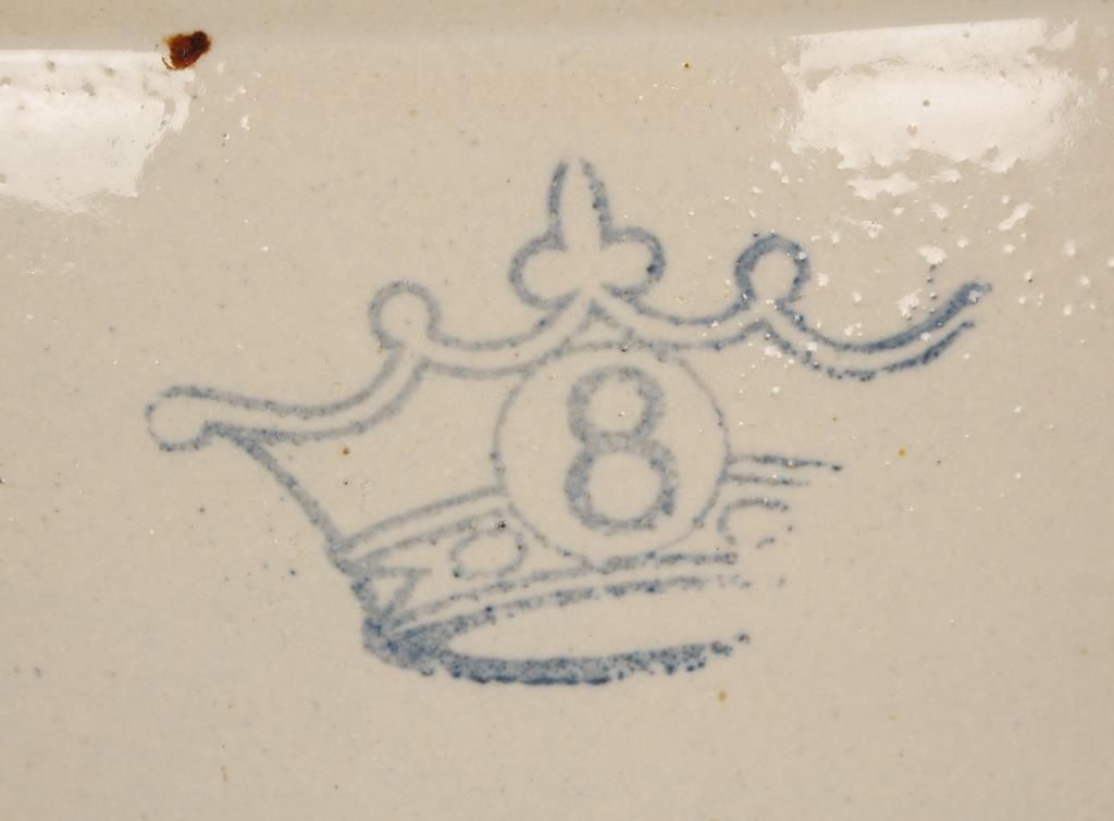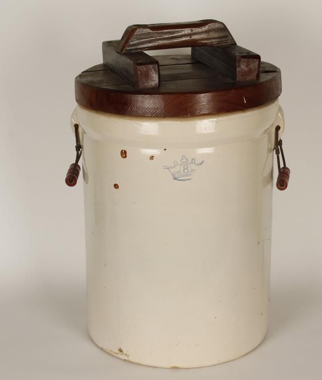 Crockery with wooden lid. Approx. 18" high and 14" outside diameter. Marked with an "8" in a crown for 8-gallon capacity. Has two wire bale handles on the sides.