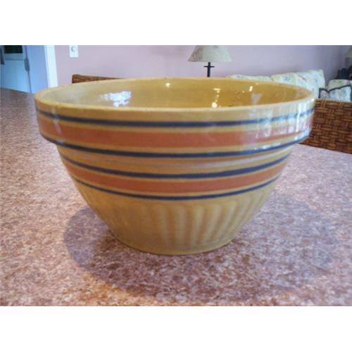 </font></strong>This is an old shoulder bowl with an 8" diameter that I'm 99% sure was made by Red Wing Pottery. It is not marked, but I lived in Red Wing Minnesota for 5 years and saw many bowls just like this one. There pottery bowls were often unmarked. This is a good example of pottery from the 40's. It is 4" tall and has only slight crazing in the bottom. No chips or cracks are noted. It does have a glaze pop on the inside. This happened during the firing of the bowl and was not unusual for the process at that time. It's in very good condition for it's age. It displays beautifully and is a delight to use.</font>