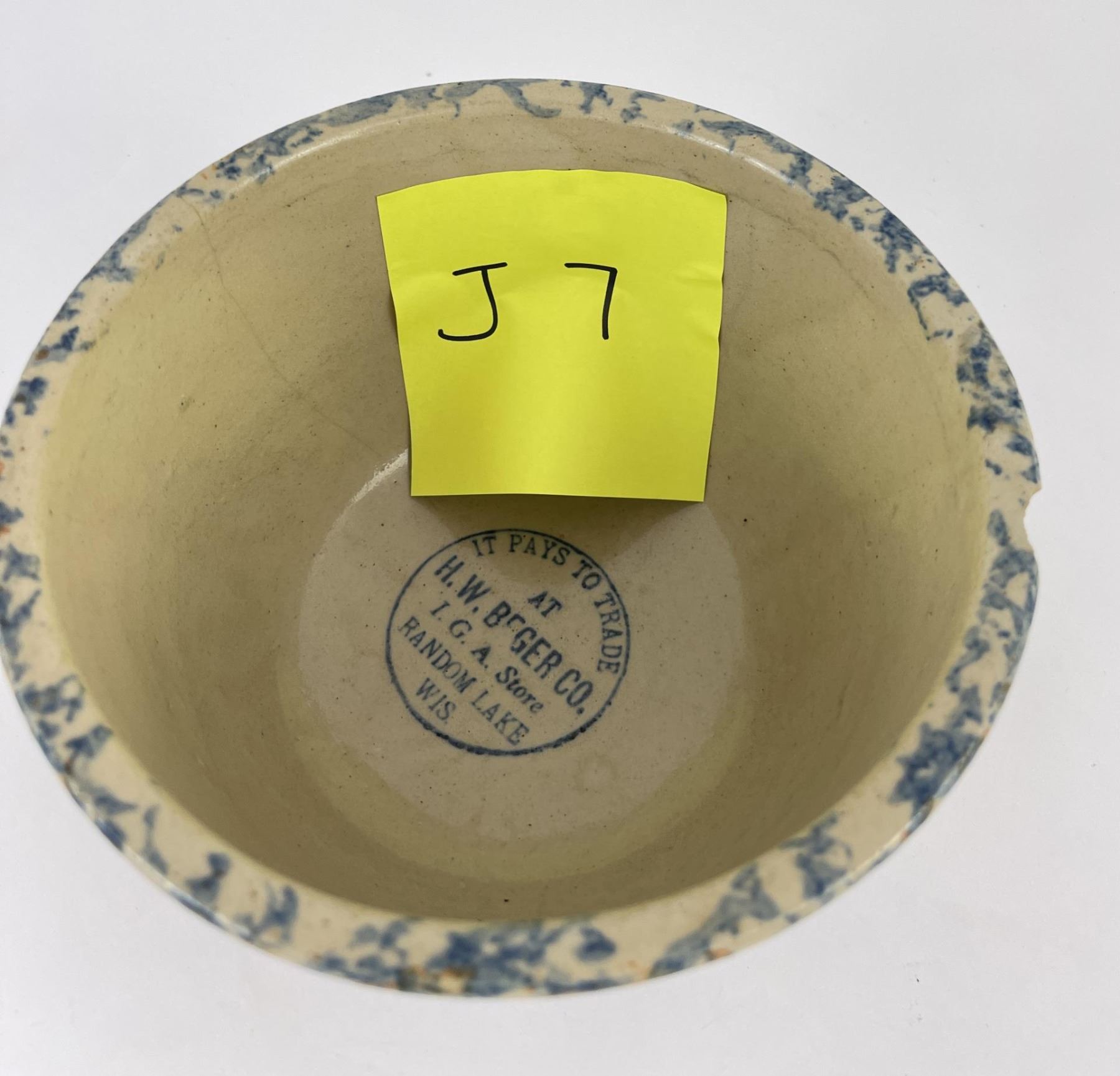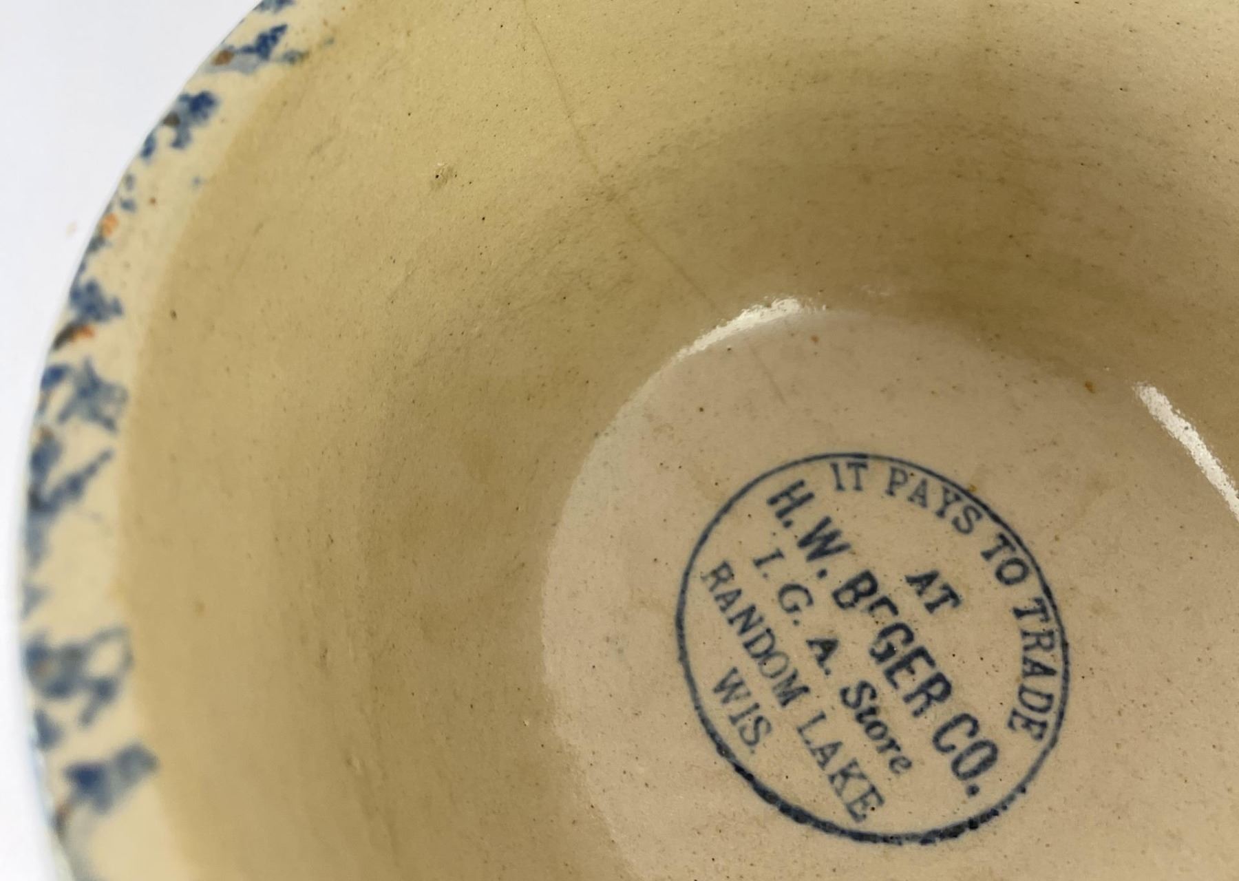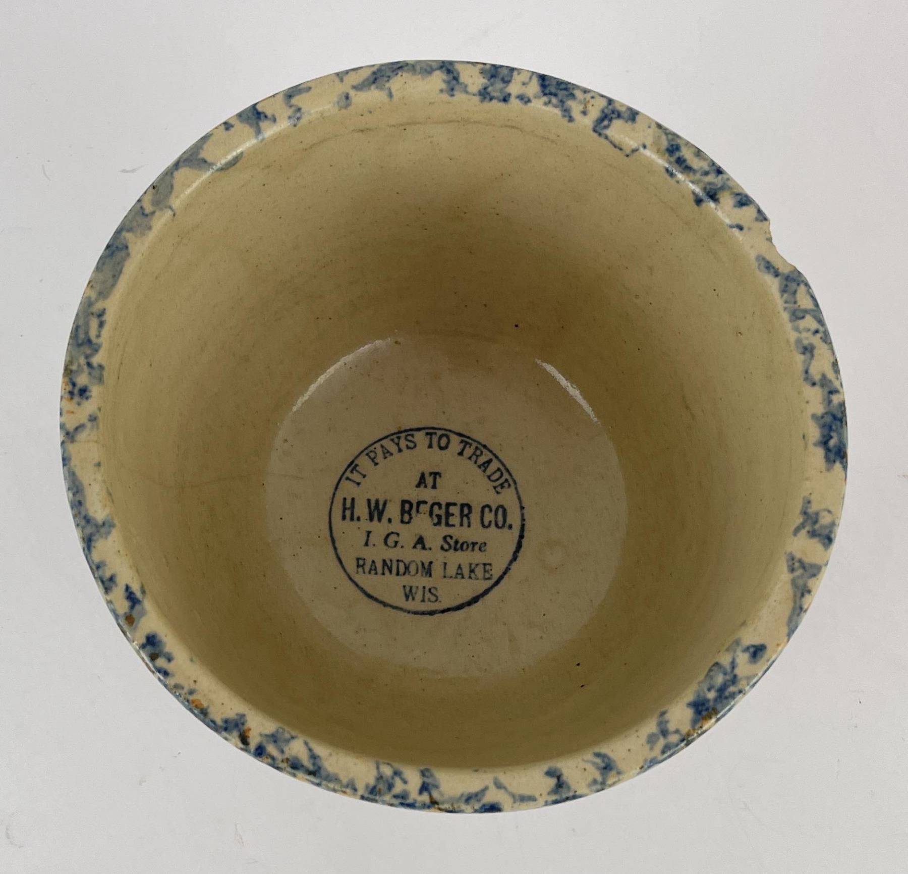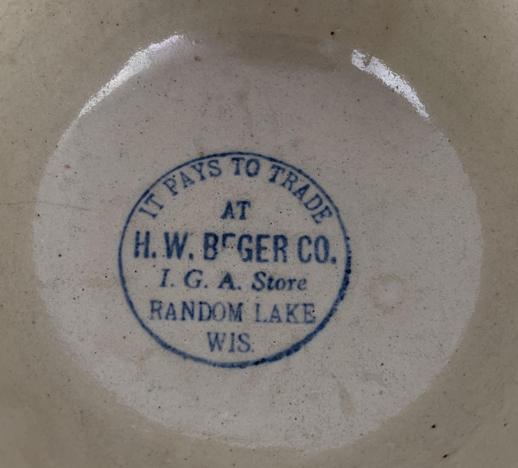 Advertising in the bottom from HW Berger IGA Store Random Lake Wisconsin. 7 1/2" diameter.