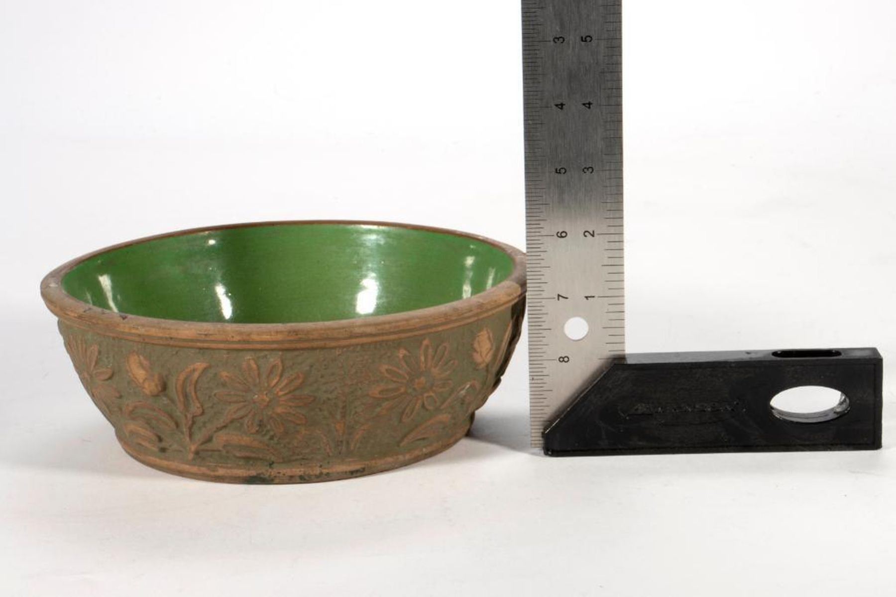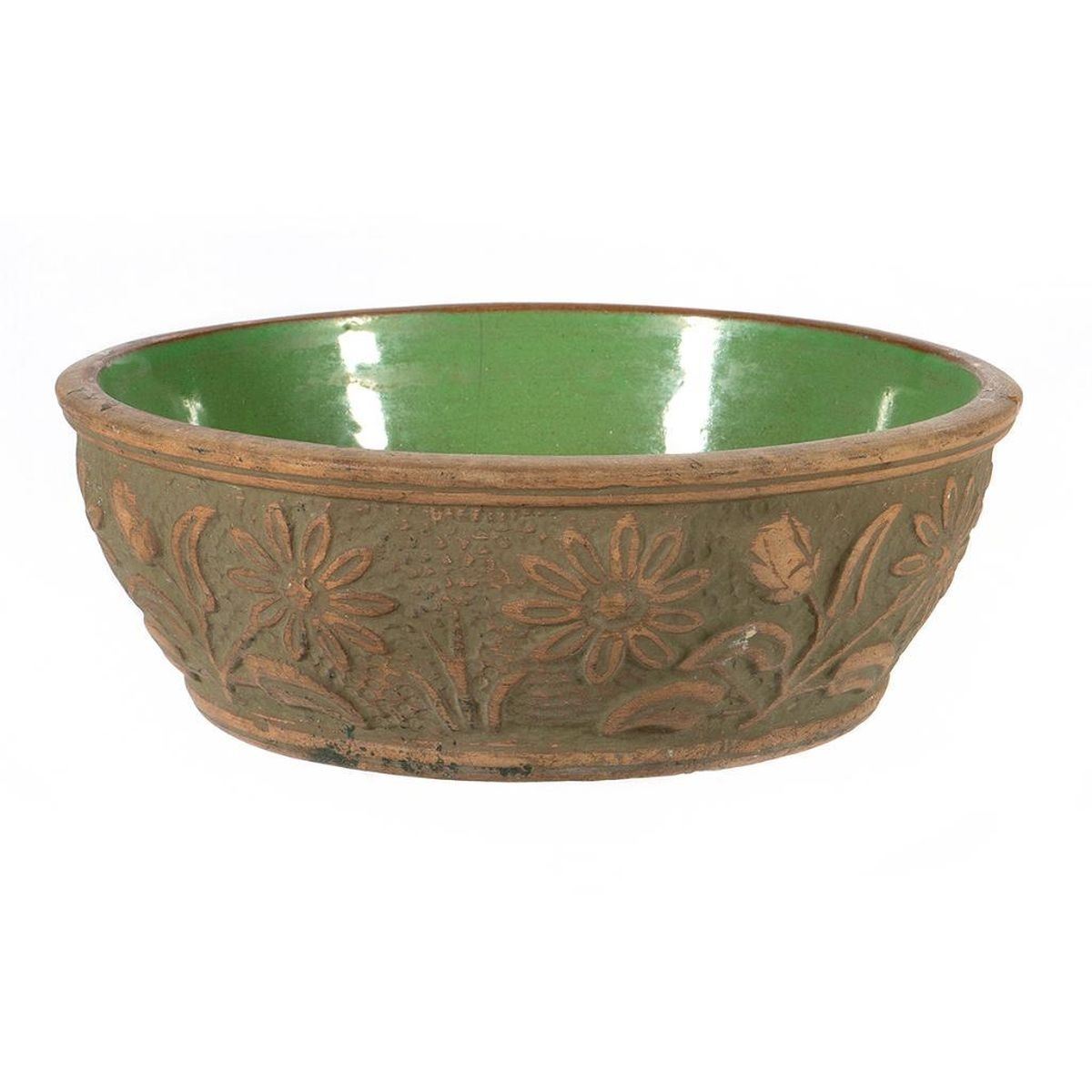 Floral incised and green glazed low bowl. Stamped on base. 3in.h 7 1/2in d. Condition: Good, very minor scratch to rim.