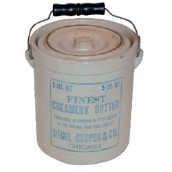 Red Wing stoneware butter pail w/advertising-Siegel Cooper & Co.-Chicago, 5 lb., bottom stamped RWSCo, w/lid & bail handle, Exc. condition, 7.5"H.