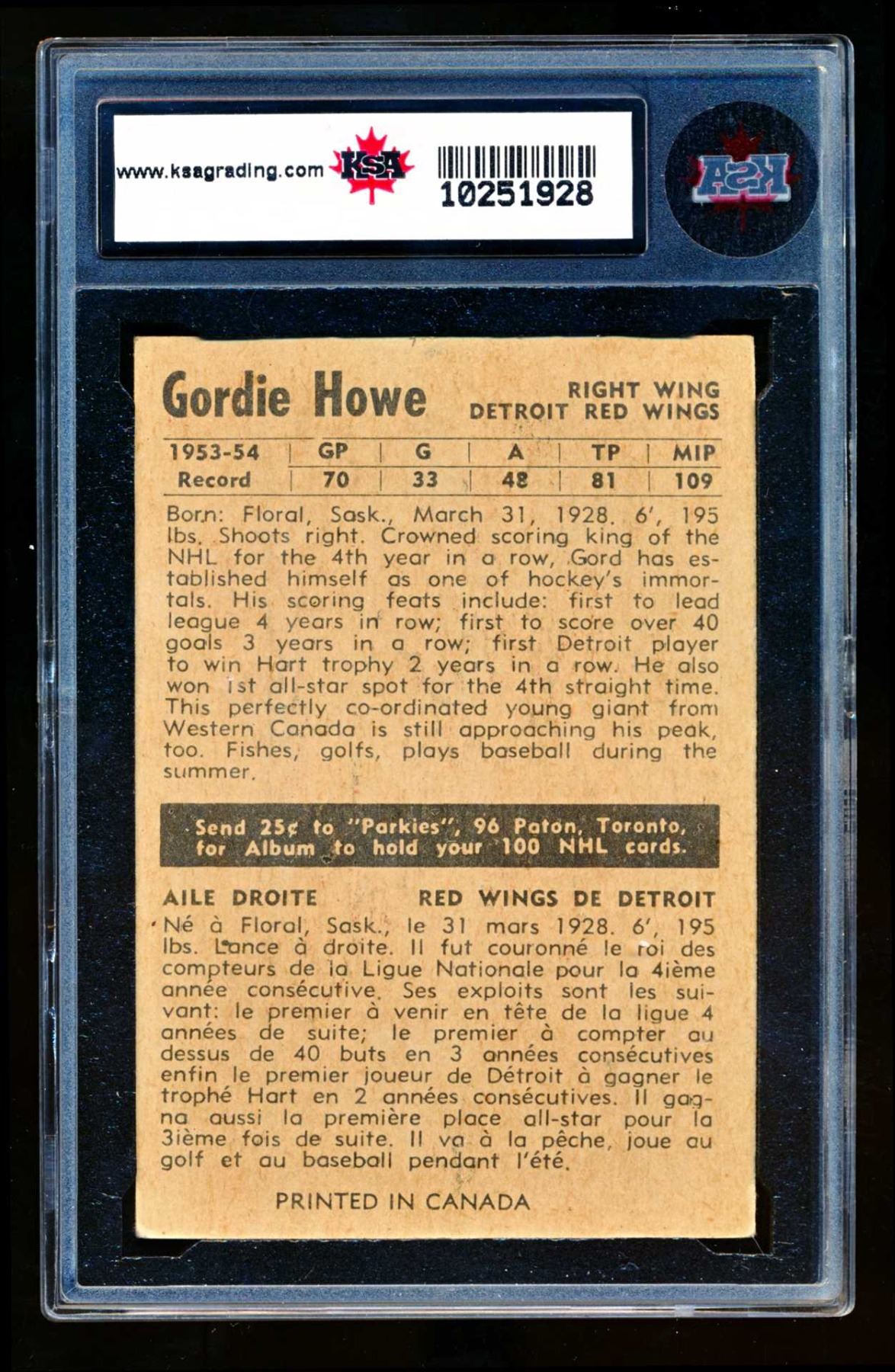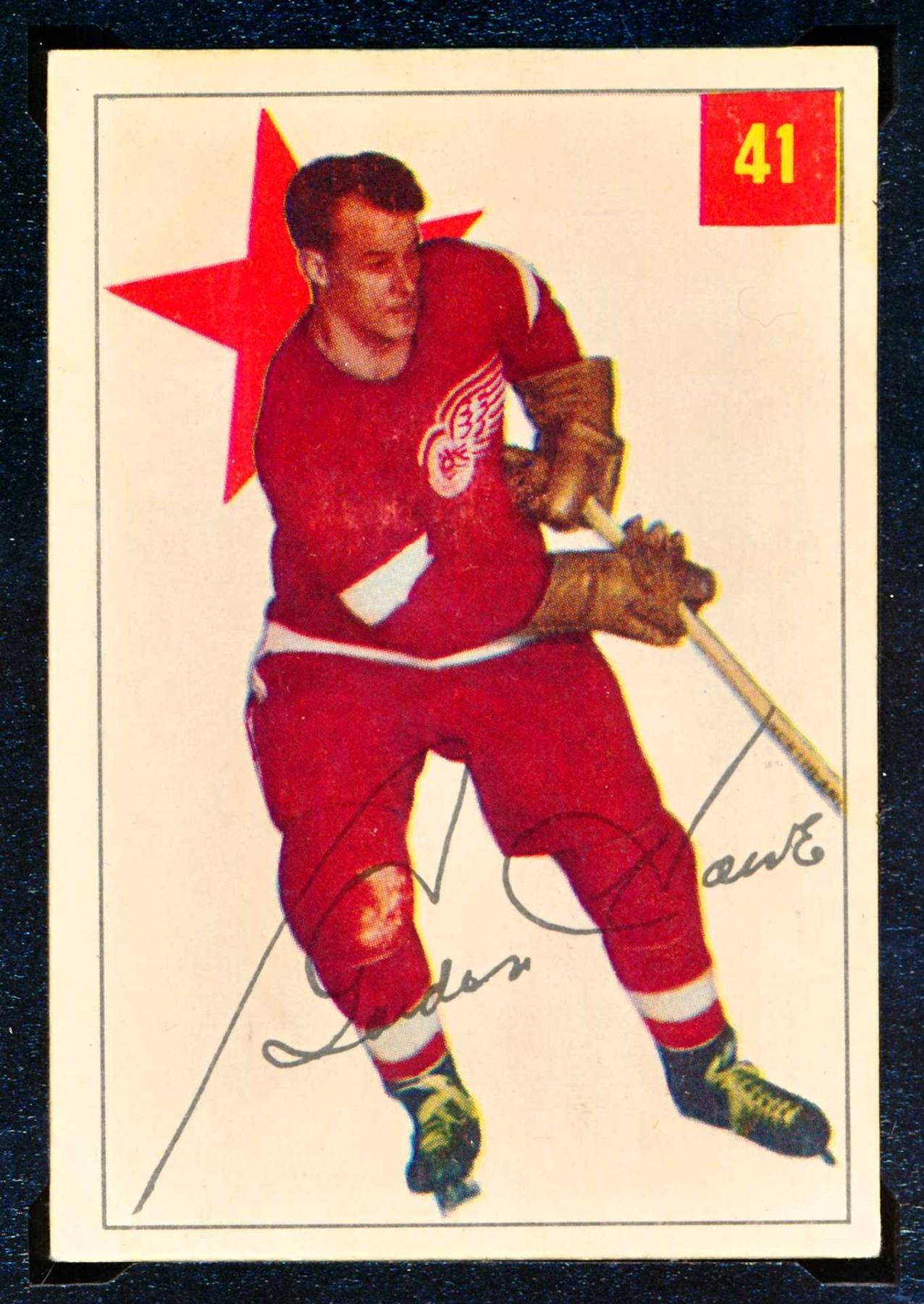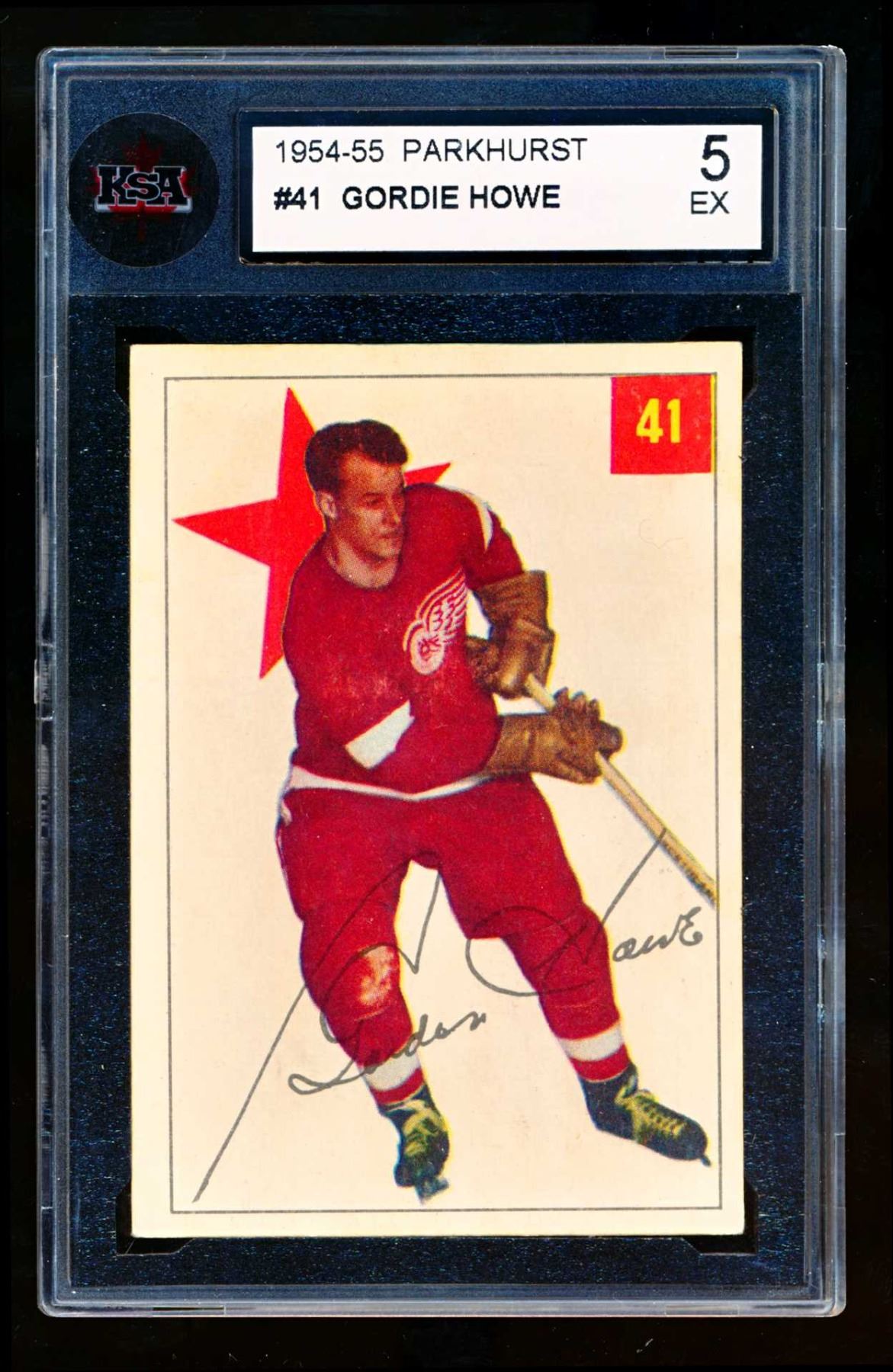 Red Wings Gordie Howe #9, (1954-55) Card #41, printed by Parkhurst graded KSA: EX-5.