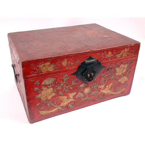 <Our item number 138699><B>Red Chest With Peacock and Floral Design.</B> Wooden chest painted red with high-relief gilt peacock and floral design on the front. Date unknown. The measurements are: 11¼ in. high, 20¾ in. across, and 14¾ in. deep. No lock; some cracks to wood on top and sides. <BR>Estimated Value $200 - 400. <BR><BR>Our item number 138699<BR><IMAGES><P ALIGN="CENTER"><IMG SRC="http://www.goldbergcoins.net/liveauction/49jpegs/138699.jpg"> </P></IMAGES>