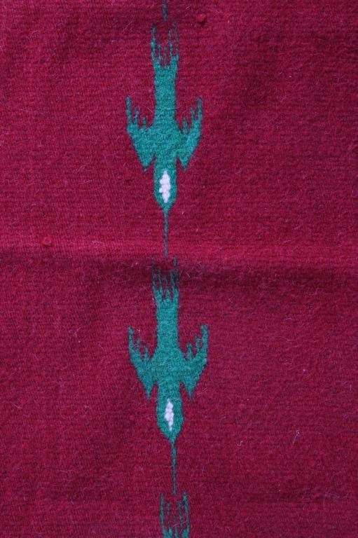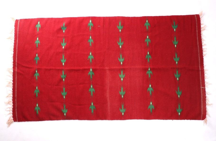 For your bidding pleasure is this Red Wool Blanket W/ Green Hummingbird Motif. This wool blanket shows wonderful patterns of hummingbird motifs. The green hummingbirds are set to a rich red field bordered with two beige horizontal lines just before wool fringe. The measurements of of this blanket is 85" x 44".