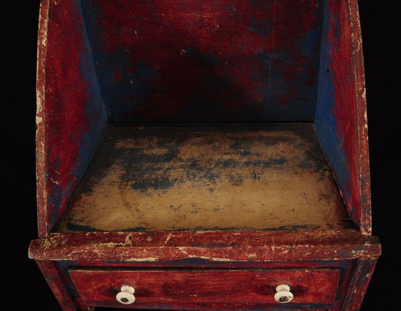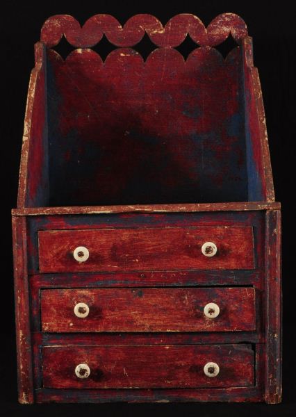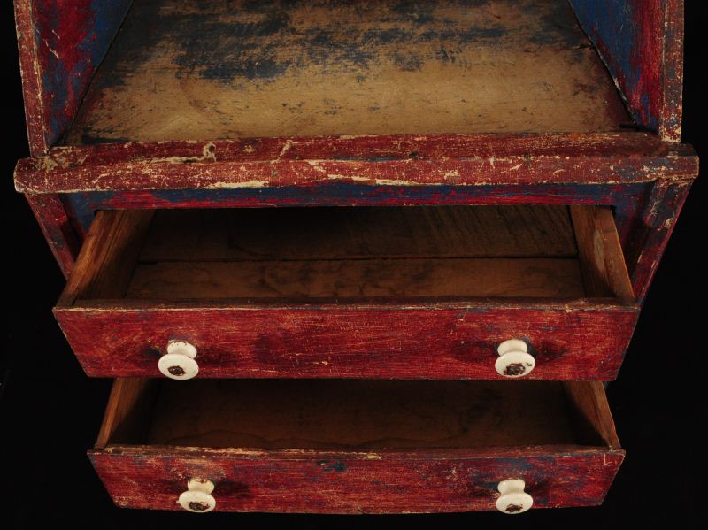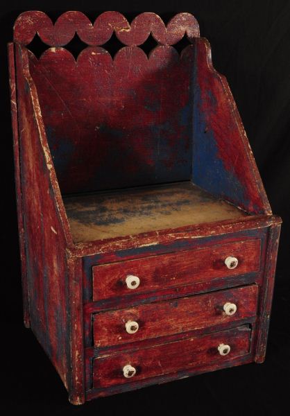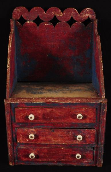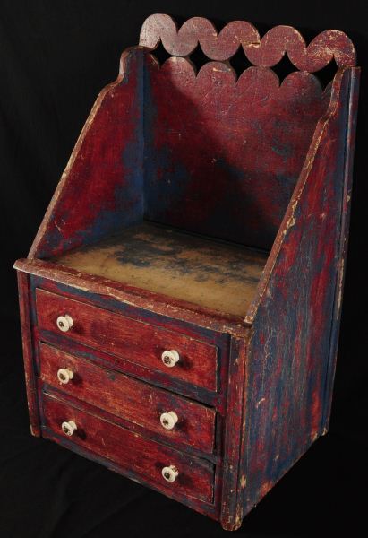Old Red/Blue Paint, Scalloped Back Splash & Glass Knobs. Measures 14" x 18" x 29"