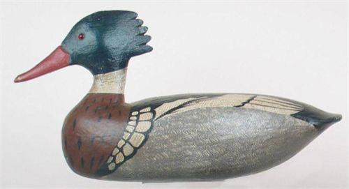 Red-breasted merganser drake decoy with glass eyes and wonderful form by Doug Jester, Chincoteague, VA. Paint has been restored in the original fashion and style. Provenance: Pitt Collection.