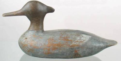 Red breasted merganser hen attributed to George Blevins, Alexandria Bay, NY ca 1920. Overall wear to the paint which is by Chauncey Wheeler. Struck by shot, Slight roughage to the tail. (decoy)