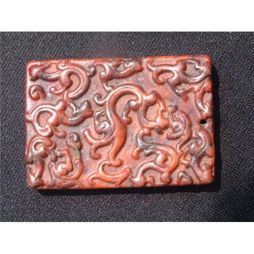 Ancient red hardstone carving in shape of a rectangular pendant featuring swimming hydra dragons. The carving dates to Western Han period and is in high relief and present on both sides. The apical part has a central perforation that allows its suspension as a pendant. Size: 2.6" X 1.8" (6.5 cm. x 4.5 cm.). Estimated value: $2500.