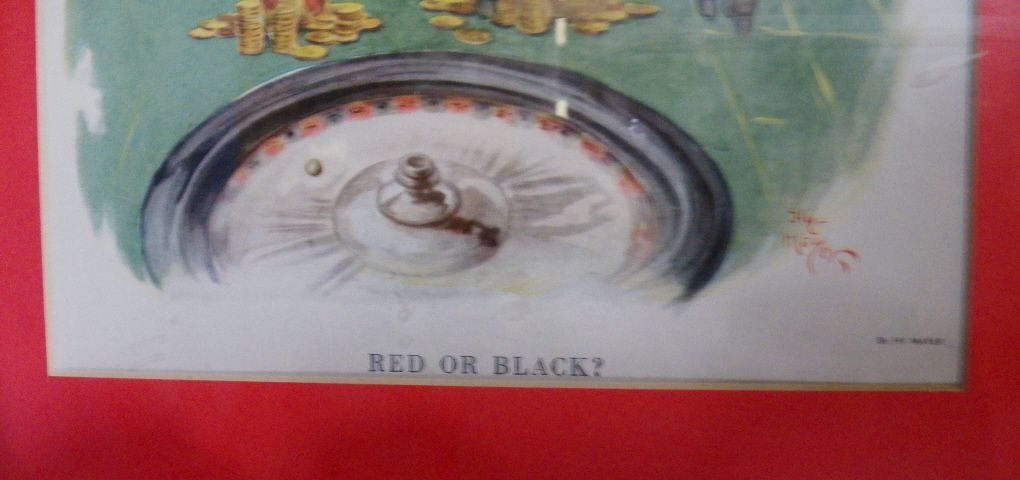 Illustration shows a man leaning on his elbows on a table with stacks of coins and a roulette wheel, a red demon is on the left and a black demon is on the right. Published by Puck publishing Corp. Sept 12, 1914