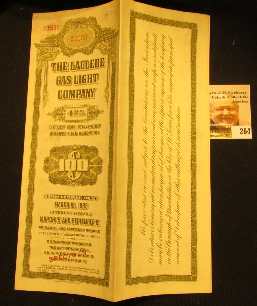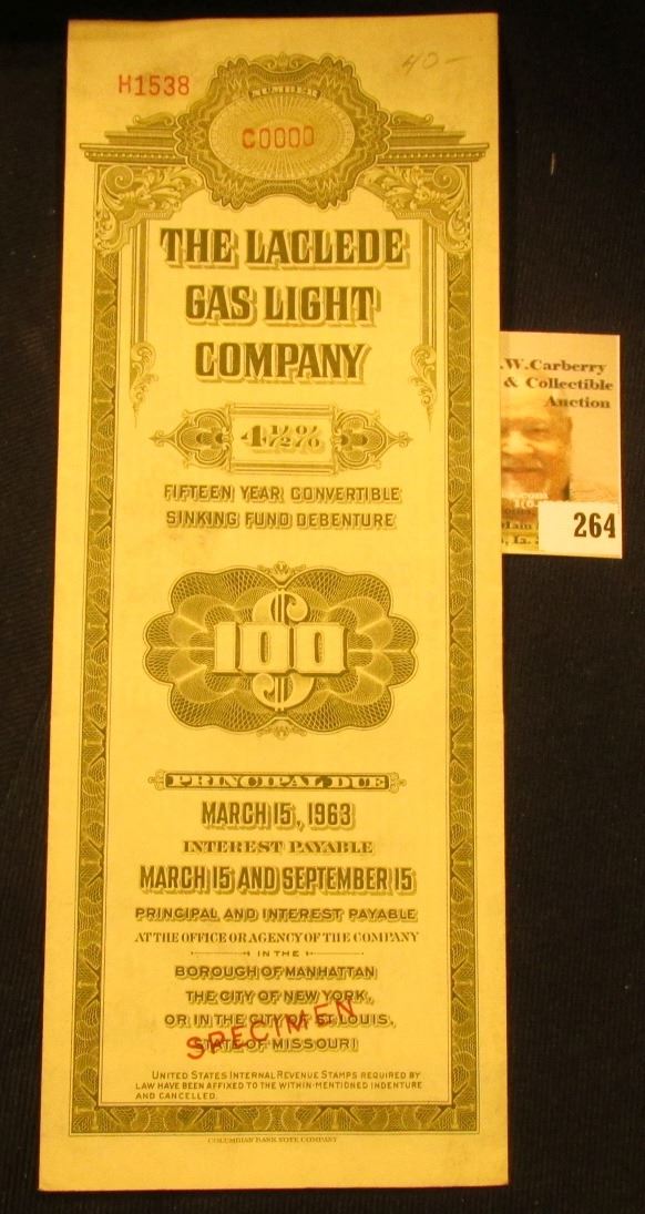 Red stamped "Specimen" "The Laclede Gas Light Company 4 1/2" Fifteen Year Convertible Sinking Fund Debenture $100…March 15, 1963..." complete with hole cancelled coupons.