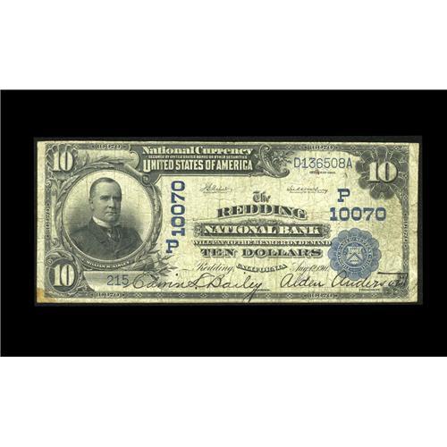 <B>Redding, CA</B></I> - $10 1902 Date Back Fr. 620 <B>The Redding NB</B></I> Ch. # (P)10070<BR>Twelve large are reported in the census for this tough to locate CA institution. <B>About Fine.</B></I> Ex. Horwedel September 2004.