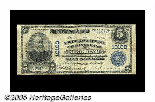 <B>Redding, CA</B></I> - $5 1902 Plain Back Fr. 602 <B>The Northern California NB</B></I> Ch. # 10100<BR>A scarce large size note from a challenging Shasta County institution. The delicate ink signatures remain dark and legible on this broadly margined problem-free <B>Fine.</B></I>