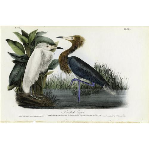 <B>Reddish Egret Audubon Royal Octavo Print.</B></I> Plate number 371 features the Reddish Egret. An adult with its full white spring plumage is shown next to a young adult with a greyer tone. Both are standing in a rather dark marshy area, and the young adult looks larger than the adult. Four pages of text from Audubon's exhaustive edition accompany this lot. The print is oriented horizontally and the holes from being disbound are on the right edge. A very clean example.