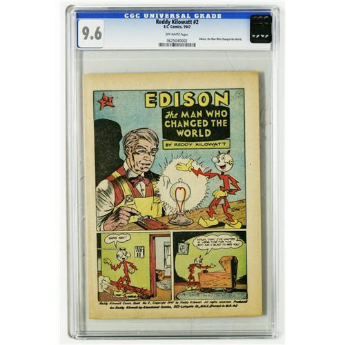 <B>Reddy Kilowatt #2 (EC, 1947) CGC NM+ 9.6 Off-white pages.</B></I> "Edison, The Man Who Changed The World." 5-cent cover price. Overstreet 2006 NM- 9.2 value = $140. CGC census 3/06: 3 in 9.6, none higher.