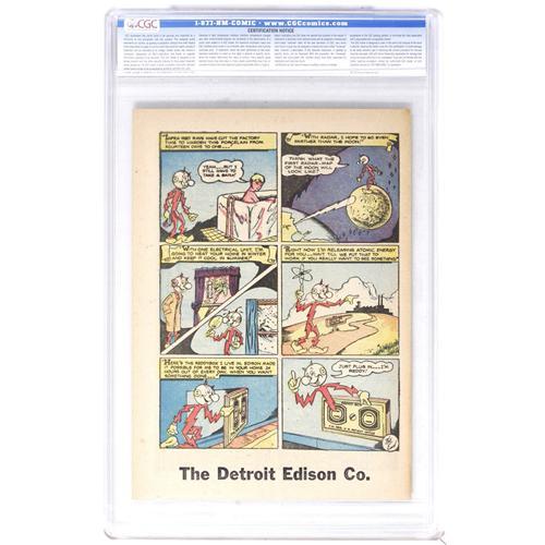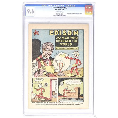 <B>Reddy Kilowatt #2 (EC, 1947) CGC NM+ 9.6 Off-white pages.</B></I> "Edison, The Man Who Changed The World." 5-cent cover price. Overstreet 2006 NM- 9.2 value = $140. CGC census 5/06: 3 in 9.6, none higher. <BR><BR><B>Important notice:</B> Heritage usually auctions material at the rate of 200-250 lots per hour. On some occasions eBay Live bid software or the Internet may not be able to keep up with the pace of the auction. We recommend placing a realistic absentee bid now as insurance to avoid disappointment. Occasionally the auctioneer may eliminate or reject an eBay Live bid, and the auctioneer may also reopen a lot after the close of the eBay live bidding (usually because we missed an audience bid), and may reject your bid even if it shows you as the winning bidder. By bidding via eBay Live, you agree that Heritage may award the lot to another bidder at its sole discretion under the circumstances described above or any other reasonable circumstances. Since eBay bids are not shown to us until we open the lot on the floor, we treat those bids just like floor bids. In most cases the floor responds before the eBay bid is presented to us, due to Internet lag time, so for consistency we have made it a policy that floor bids are always considered first over tie eBay live bids. Also please note that all Heritage lots purchased through eBay Live carry a 22.5% Buyer's Premium. Please make sure you read the Terms and Conditions before you bid. This lot is being auctioned in conjunction with a live floor auction by Heritage Auction Galleries. All final auction and invoice information will be supplied by Heritage Auction Galleries, and all other information should be considered preliminary. Lot:41001 <BR><BR><B>Winning Notification and Billing:</B> After the FINAL session in this auction is complete, Heritage will send e-mail and snail mail invoices. This process normally takes several days. All final auction and invoice information will be supplied by Heritage Auction Galleries, and all other information should be considered preliminary. <BR><BR>This auction will be conducted on a live auction floor and over the Internet through eBay Live. If you choose to place an absentee bid, please take a moment to <font color='#0000ff'><u><a href='http://pages.ebay.com/liveauctions/help/before/laabsentee.html'>learn how eBay Live absentee bidding works</a></u></font><font color='#000000'>