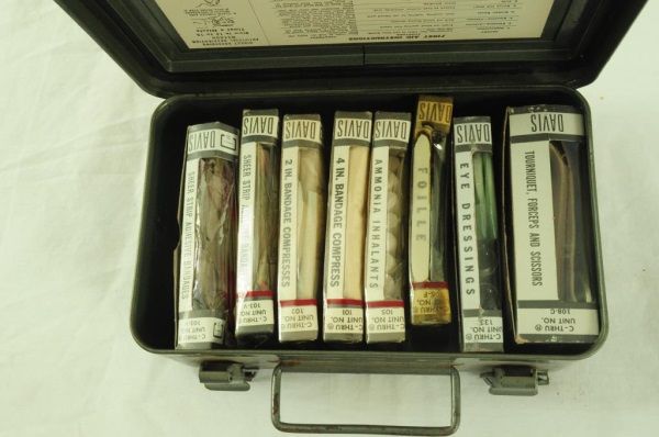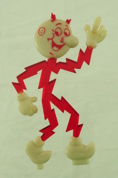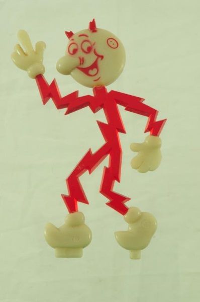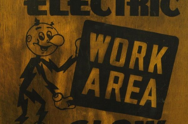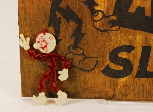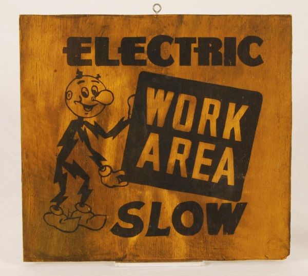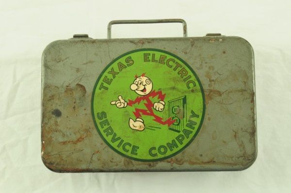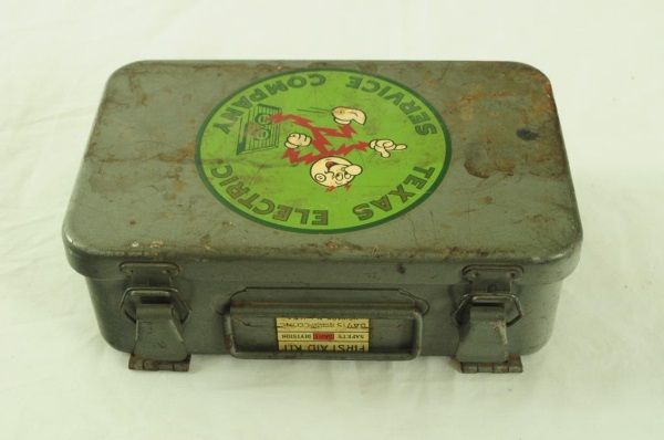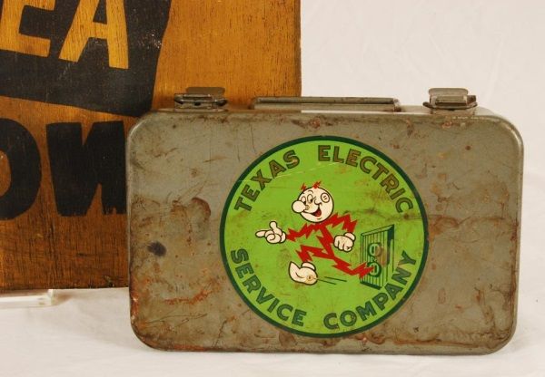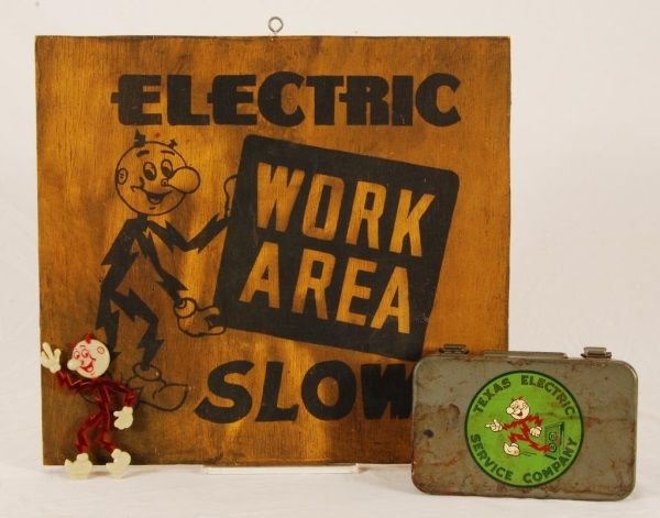 Electric Work Area Wooden Sign (16" x 17 1/2" x 3/4"); Texas Electric First Aid Kit (5" x 8" x 2 3/4"); and Celluloid Reddy Kilowatt Figure (5-1/2” H).