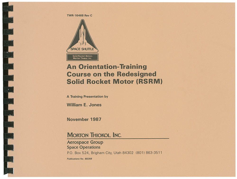 Spiral-bound manual entitled “An Orientation–Training Course on the Redesigned Solid Rocket Motor (RSRM),” 11.25 x 8.5, 203 pages. This internal manual was issued by Morton Thiokol in November 1987 after the Challenger disaster. An introductory page reads, in part: “The 51-L (Challenger) accident has led to a massive effort to critically re-evaluate, study, and test every component and every aspect of the Space Shuttle program.” In fine condition.